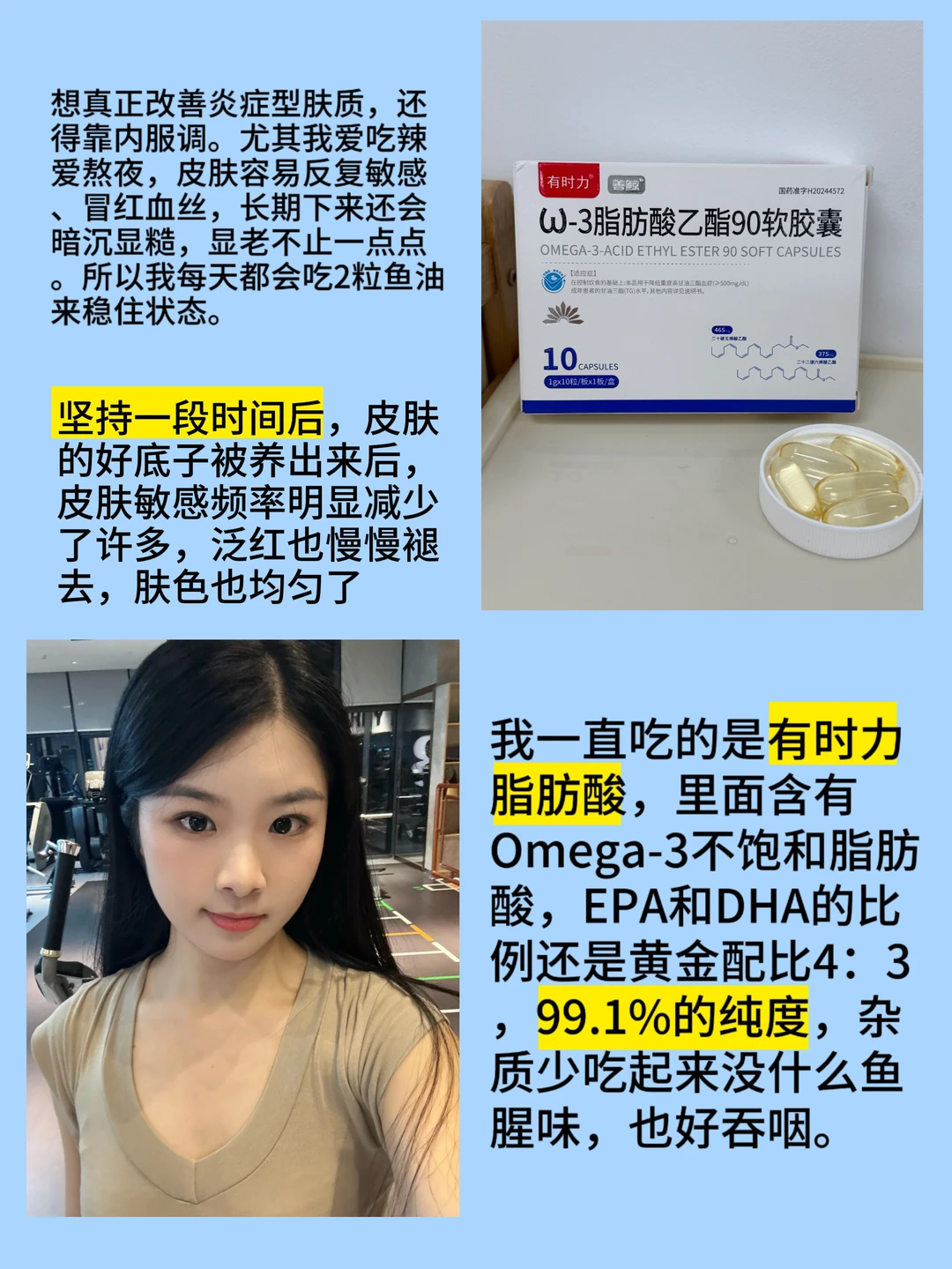 外在护理最多能够缓解20%,想真正改善炎症型肤质,还得靠内服调。尤其我爱吃辣爱熬夜,皮肤容易反复敏感、冒红血丝,长期下来还会暗沉显糙,显老不止一点点。所以我每天都会吃2粒鱼油来稳住状态。