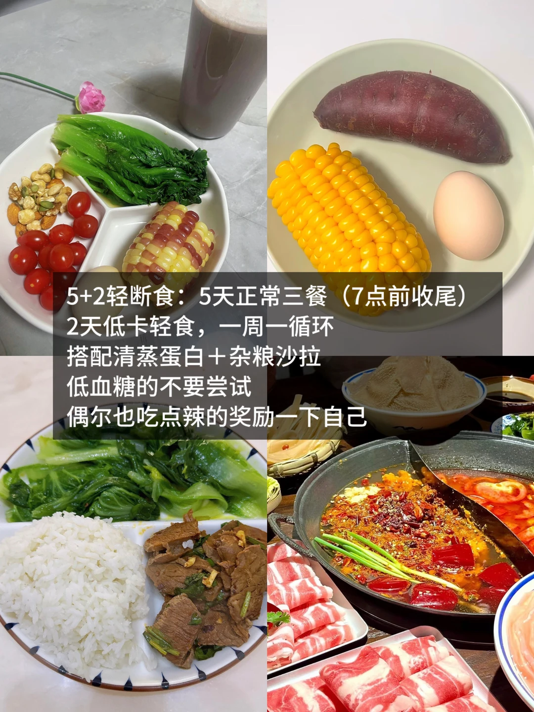 👉5+2轻断食:5天正常三餐(7点前收尾),2天低卡轻食,一周一循环,搭配清蒸蛋白+杂粮沙拉,低血糖的不要尝试。