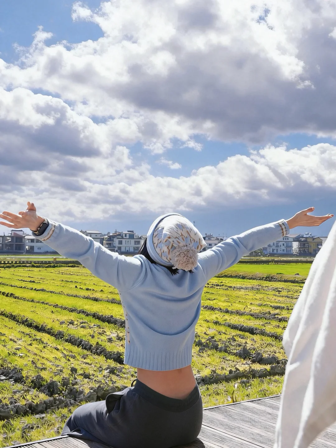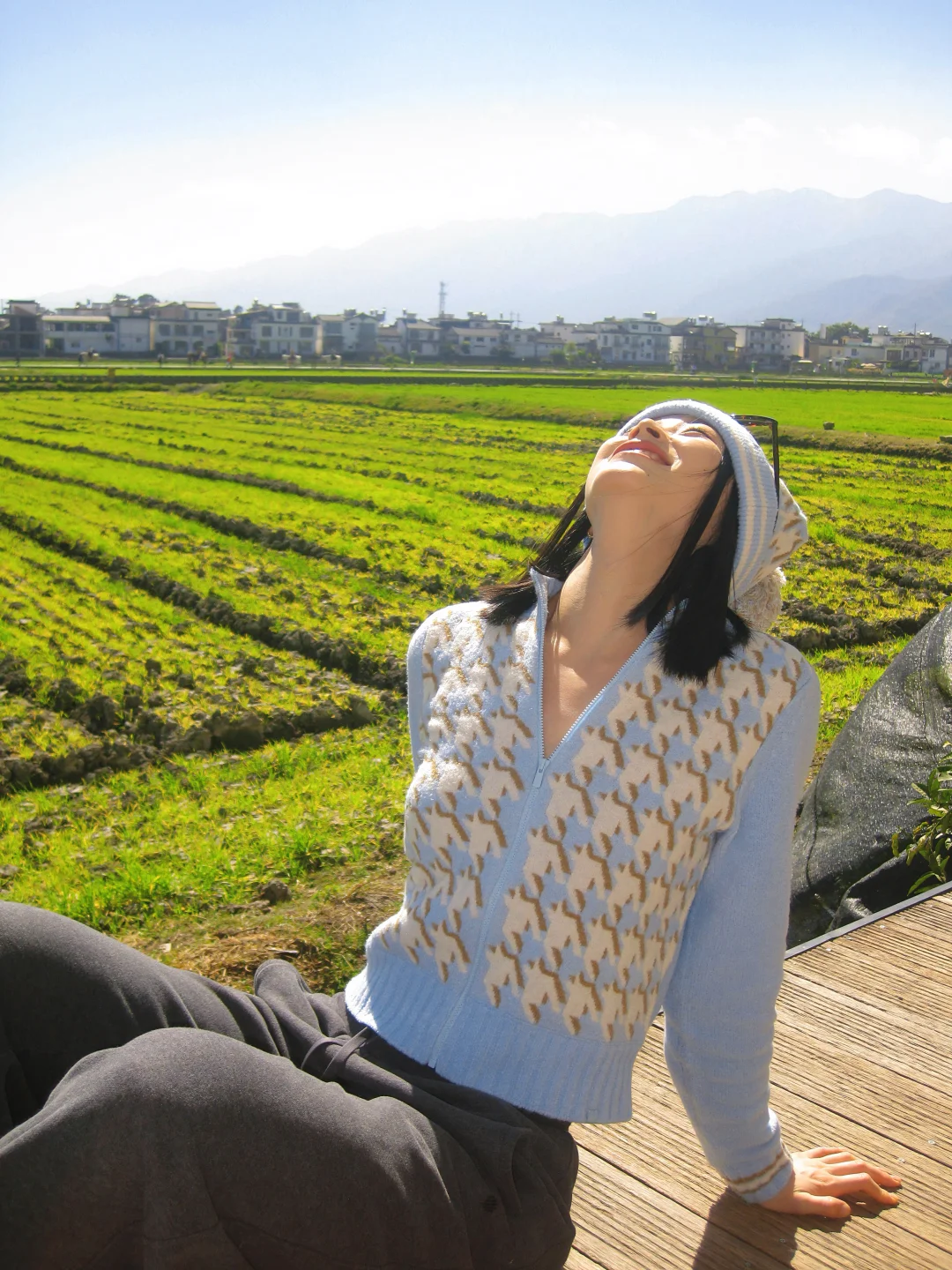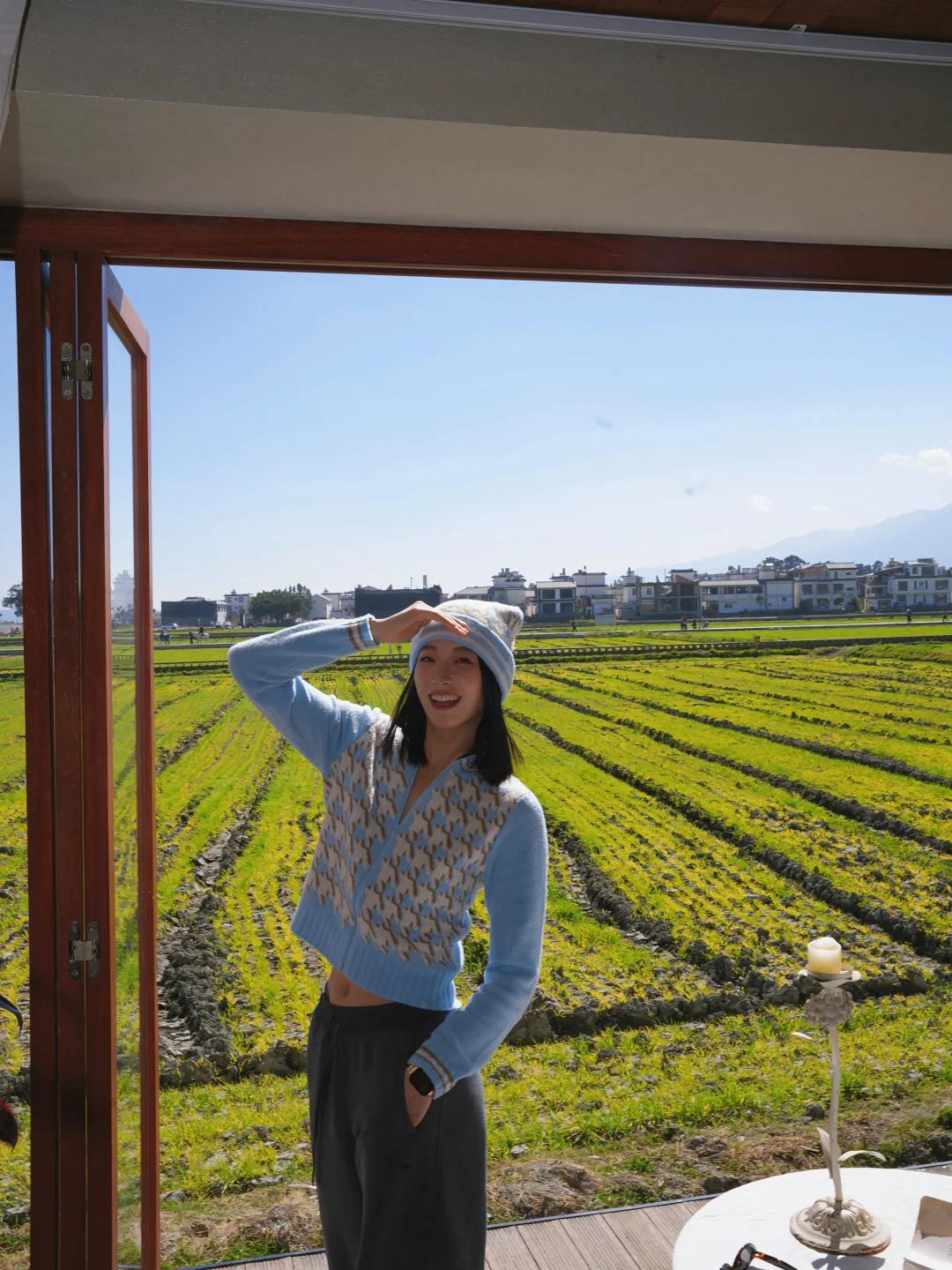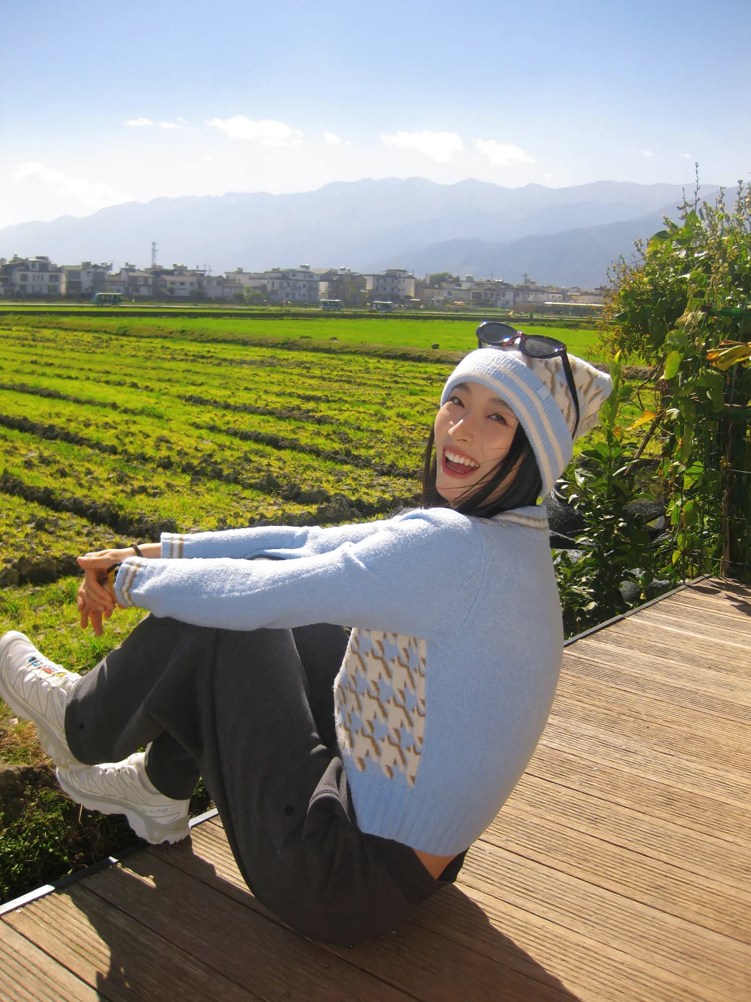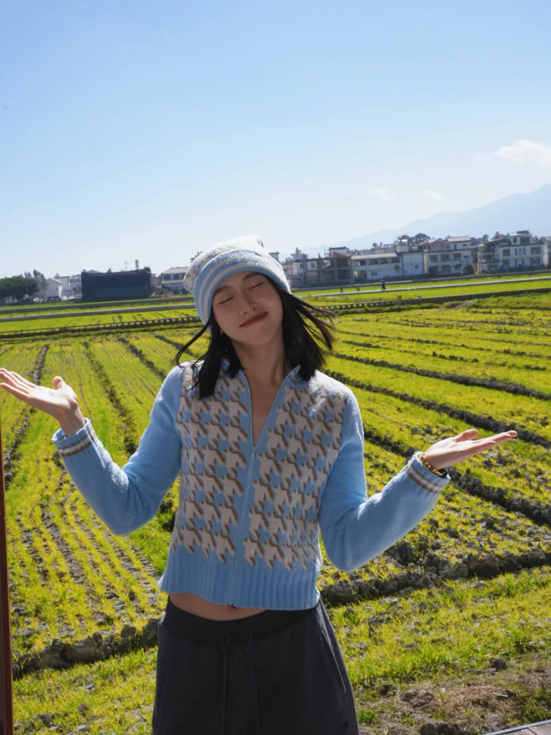 在喜洲古镇漫无目的地走 阳光正好 连穿搭都和这片风景完美同频 这件千鸟格毛衣 让我这次大理之行赢麻了! 是一眼就心动的版型 慵懒又随性 针织面料 贴身穿巨舒服 🩵奶蓝色很出片 配同系列冷帽 温度颜值双在线 和大理的自然感适配度99.99% 随便拍都有种慵懒的户外松弛美 谁穿谁好看! 吹着洱海的风 感受自由的气息 一件舒服的开衫 让度假的快乐加倍~
