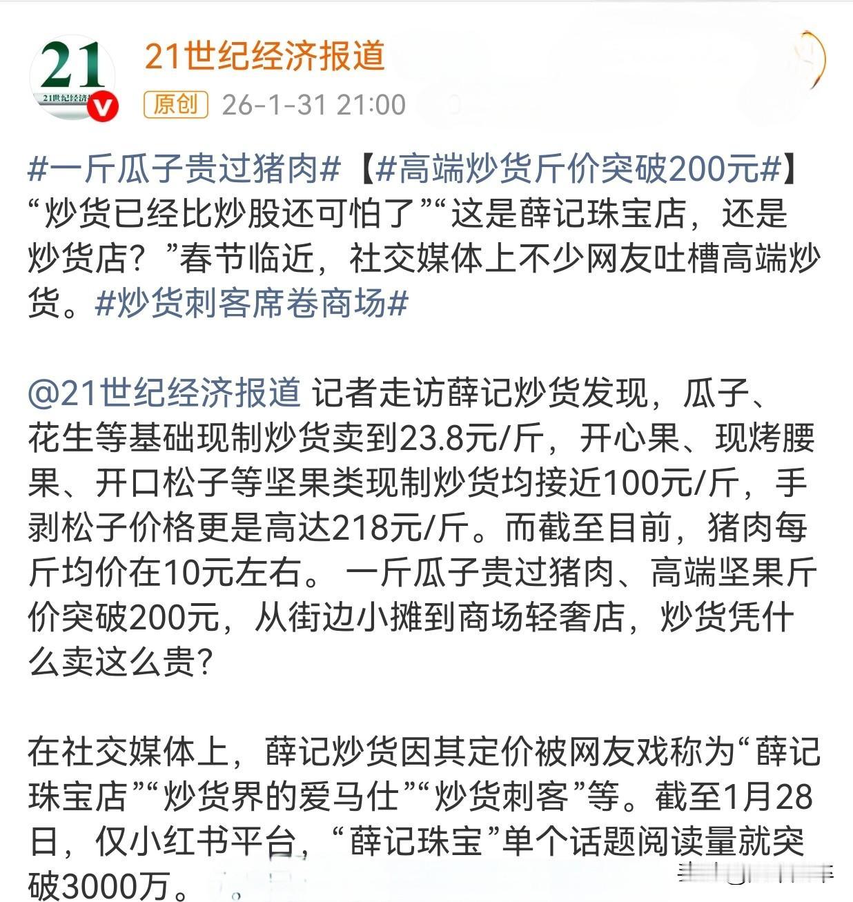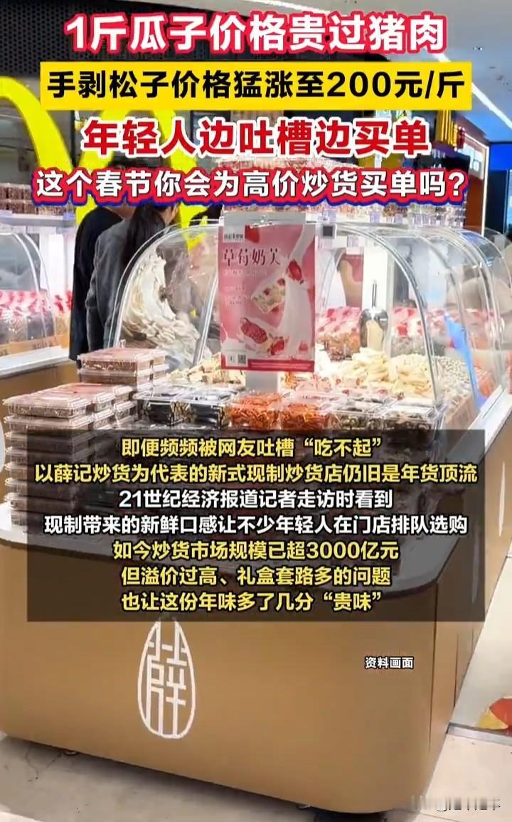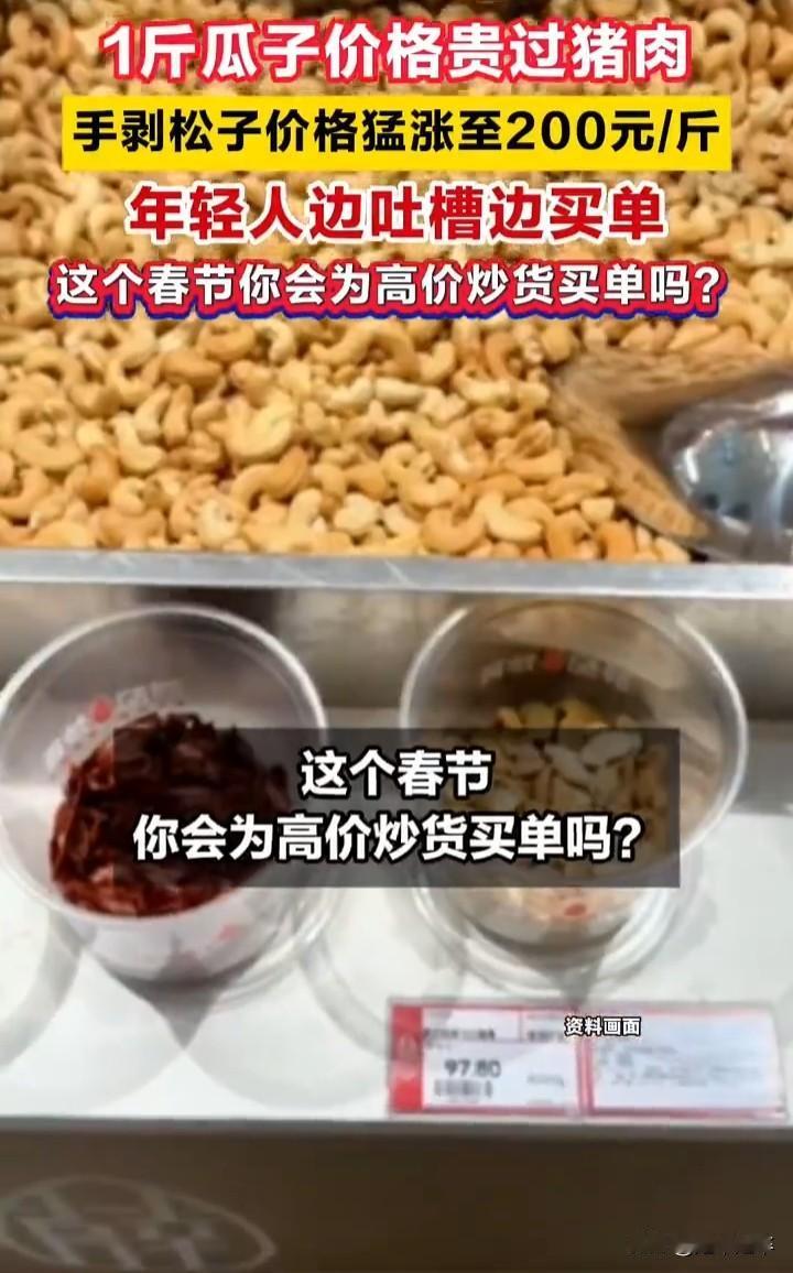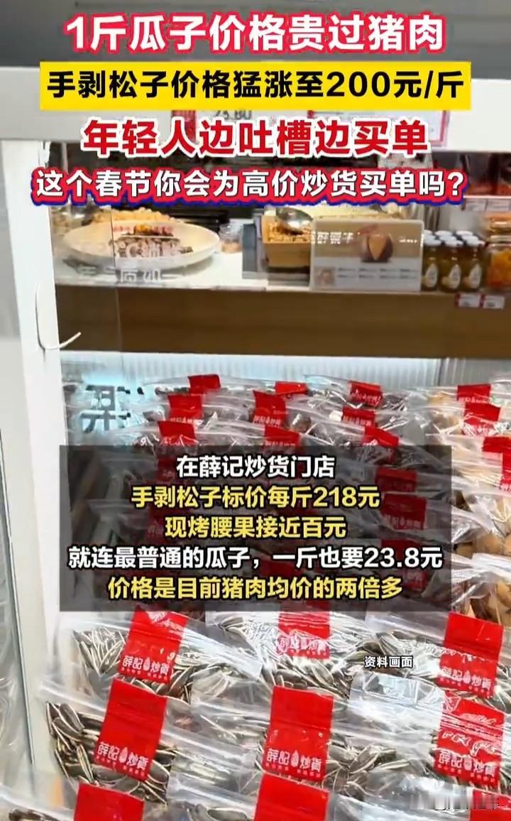 佳节临近,一斤瓜子贵过肉! 春节前夕,一斤瓜子23.8元的价格远超10元左右的猪肉均价,高端坚果甚至突破200元/斤。 炒货高价背后的三大推手:①品牌化,从街边摊位转入商场内门店,租金、装修和人力成本大幅上涨。②高端品牌宣称精选特定产区大颗粒原料(每斤瓜子严格控制在2000粒±5粒),采用低温慢烘、独立包装等工艺,提升生产成本。③轻奢礼品化,春节坚果礼盒市场需求暴增,包装好的礼盒炒货成为年货顶流。 当礼盒炒货脱离平民零食认知,以奢侈品姿态出现时,这个行业该是到了击鼓传花的末端了。消费者对价格的容忍度是有限度的,一万元可买700斤猪肉或3500斤黄瓜,但仅购约45斤高端品牌的松子,如此的性价比绝对会抑制商品的复购率。消费者怀念过去一毛钱买一大袋瓜子的质朴年代,如今15元/斤的瓜子却变成物质丰富却价格膨胀的象征。想想当年的天价月饼最后还不是受到有关部门的制裁。炒货瓜子 干果瓜子 食品瓜子