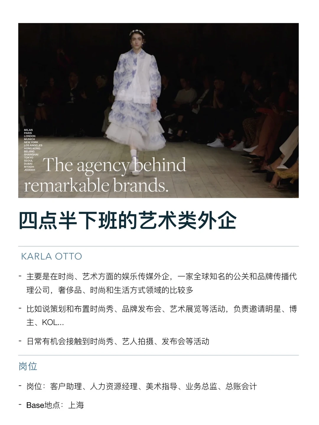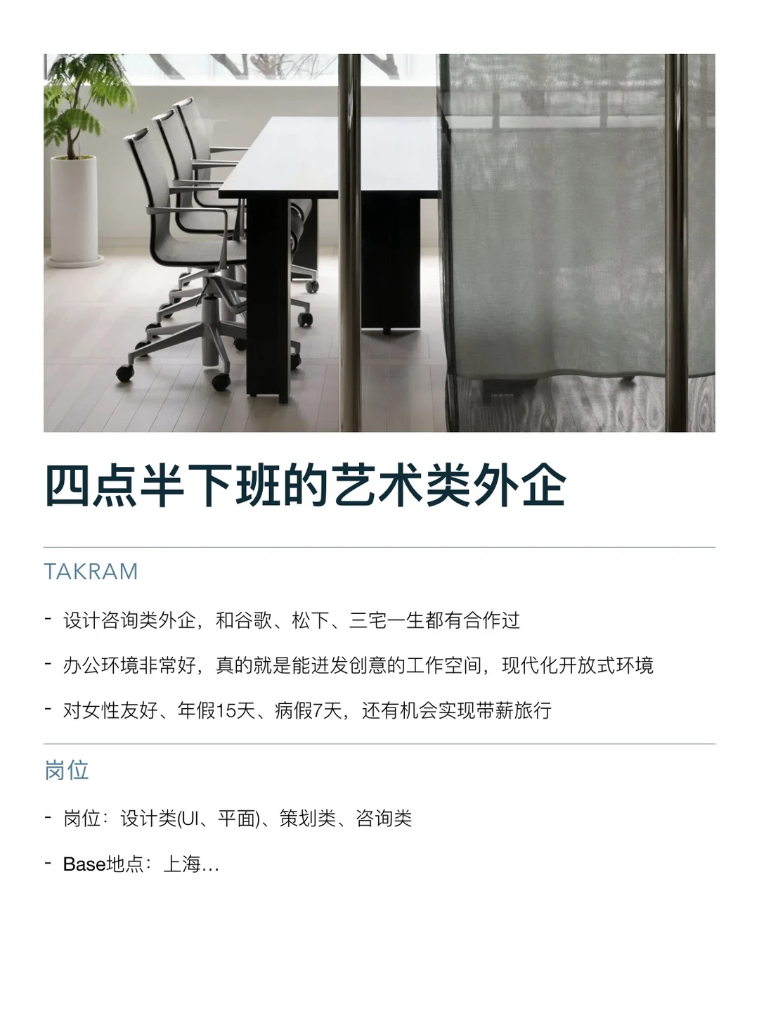 整理了一波艺术相关的外企,特别适合对审美有要求、有视觉表达和创意能力的人 . 都是偏设计、创意方向的外企,像艺术、展览、文化体验、内容策展...都是比较有意思的,还会有各种各样的看展机会、参加活动、品牌合作,满香的 . 而且是外企,相对来说工作体验会更好,基本上都是 955、双休、年假 10–15 天起、支持弹性办公或远程。如果你是对视觉、创意这些感兴趣的,真的可以去试试 . 坚持日更✊🏻,对外企感兴趣的欢迎常来看看 .
