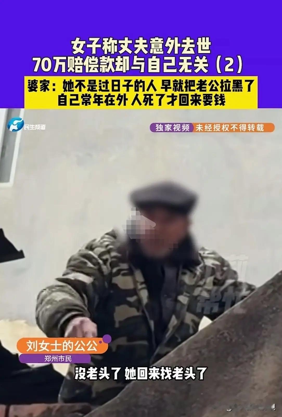 河南洛阳,女子嫌二婚丈夫又穷又窝囊,迁走户口跑去新疆,过年都不回来团圆,唯一的联系就是要钱,网名改成:随缘寻找知己。丈夫在工地意外去世,她都不知道,听说赔了70万,立马跑回来撒泼打滚,说婆家霸占他老头的死亡赔偿款,被婆家关在门外不让进门。 有网友表示:5年都不在家了,又没有夫妻生活,夫妻关系名存实亡,法律规定2年不在一起的夫妻,以不存在夫妻关系。法律是不认可的。 你老两口提前把这七十万取出来躲在外面去挥霍完也不给这样的女人,法院判决给她多少你爽快答应,但就是不给,枪毙也不给这种女人,让她打滚也找不到地方,你自己都老了怕啥征信不征信的,以小人治小人。 5年不回家与丈夫团聚,在法律上可以视为夫妻分居。依法可判决夫妻婚姻已破裂。女方不享受男方死亡赔偿款。 这件事法律会支持这个恶媳,因为他们的婚姻有效合法,但是公公婆婆可以在法律之外维权,毕竟钱在自己手里,我就是不给,你能拿我怎样呢?最多就是司法拘留,老年人,让法院拘留一个试试。 对此大家怎么看呢