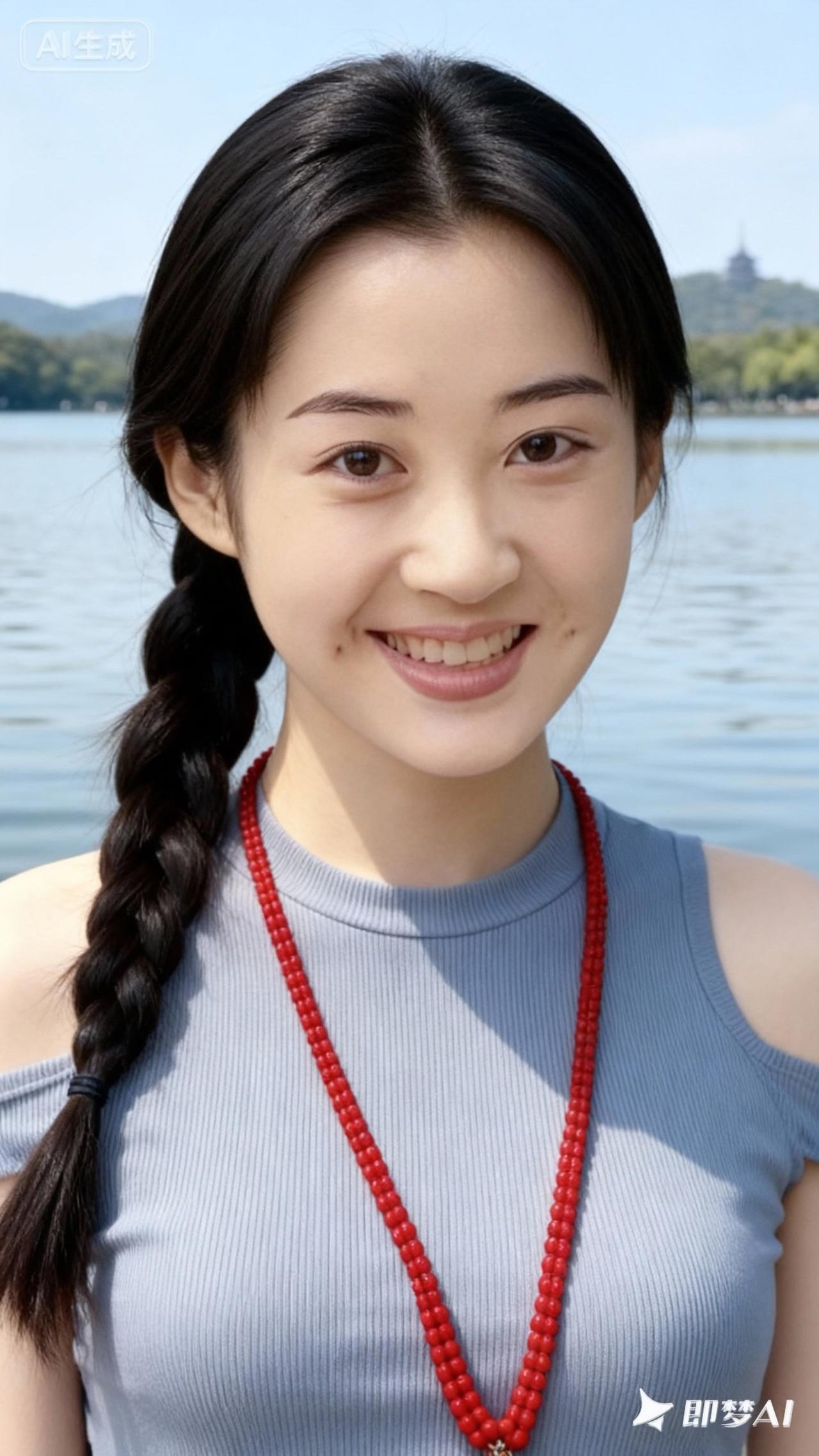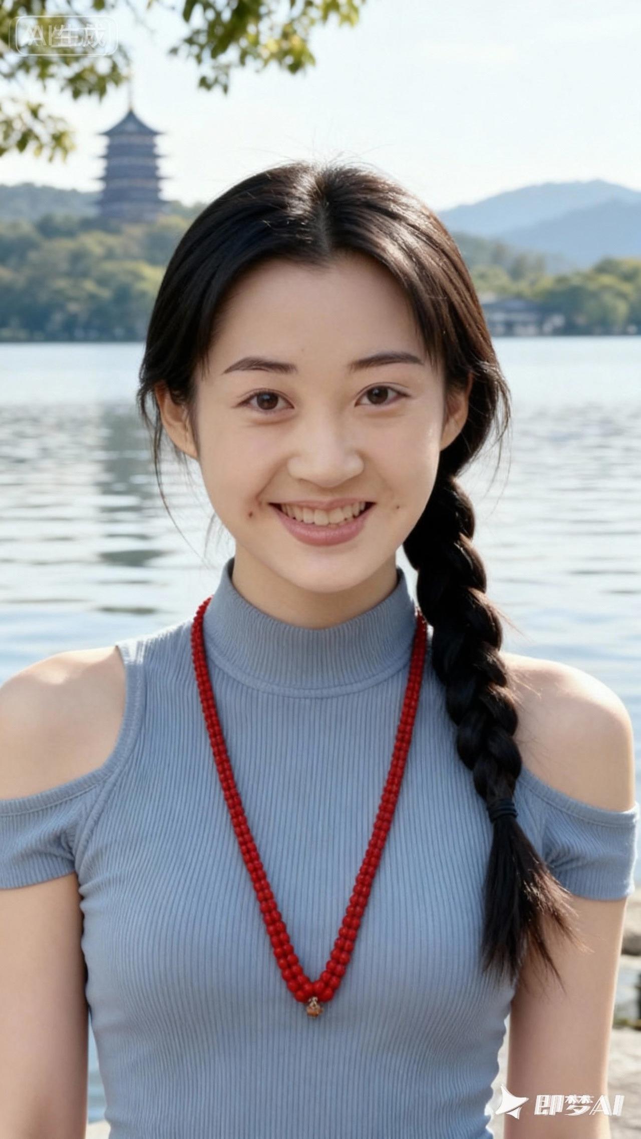 优雅蓝花裙,珍珠项链点缀,甜美笑容,尽显女性魅力!