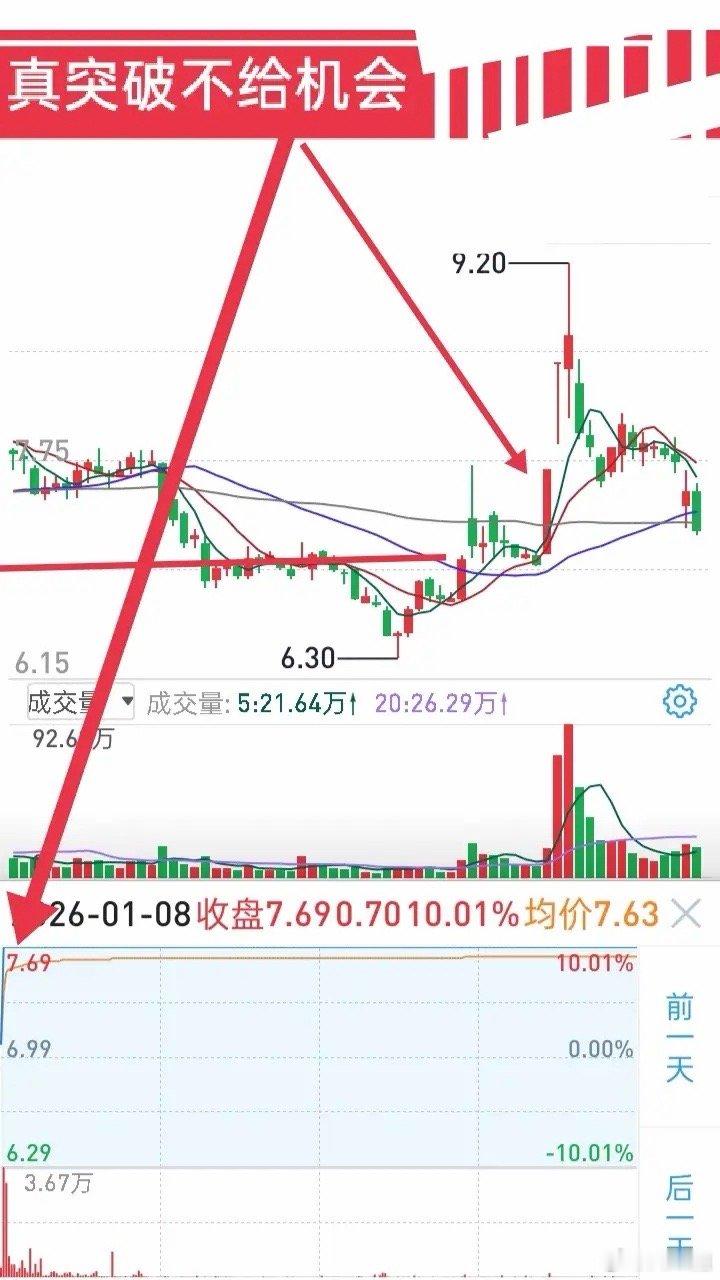 再看两个突破案例:左图是假突破,高开看似强势,冲高后量能跟不上,股价慢跌收尾,全程随便买,看似回调实则主力出货,当天进场的短线客全被套,买突破一定要防这种出货陷阱。右图是真突破,二次上攻时量价齐升,一波封板,次日还大涨,但这种真突破往往很突然,短线客要么发现不了,要么发现了也买不进。