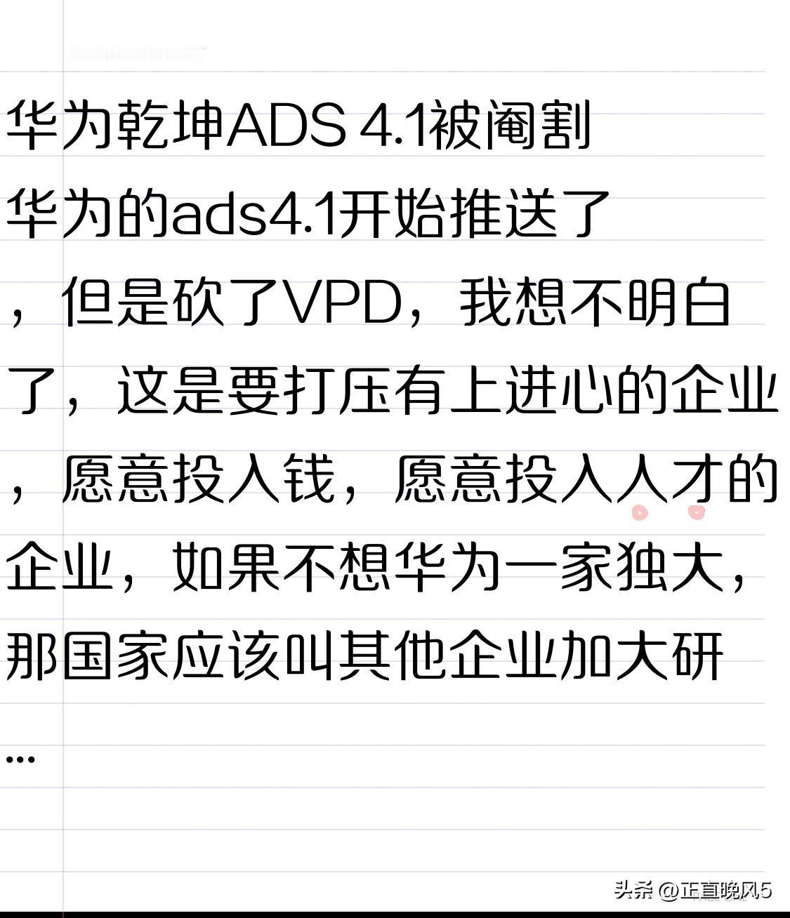 华为乾坤ADS 4.1被阉割 华为的ads4.1开始推送了,但是砍了VPD,我想不明白了,这是要打压有上进心的企业,愿意投入钱,愿意投入人才的企业,如果不想华为一家独大,那国家应该叫其他企业加大研发投入和人才,而不是限制另一个优等生的发展 这样做很打击投入巨大的企业,华为靠技术创新来获得收入的,不是靠吹牛,也不靠营销。 刷抖音看到挺多鸿蒙智行车主,在发视频抱怨,人家花了几十万买车,又花了钱买智驾包,说砍就砍了
