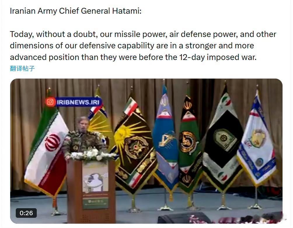 伊朗总司令哈塔米将军称: 毋庸置疑,如今我们的导弹力量、防空力量以及其他方面的防御能力,都比12天战争之前更为强大、更为先进。 这话听听便罢,不必较真。 即便从理论上来说,防空能力也难以有显著改善,毕竟时间太短,几个月能有多大提升呢? 唯一毫无问题的是导弹攻击方面,伊朗的确具备完全摧毁以色列的导弹能力。 问题的关键不在于导弹,而在于人。 再好、再多的导弹,若不敢使用,又有何用? 说白了,这不过是自我鼓劲罢了。 最终结果如何,有句话讲得好:“战争会撕去一切假面。”