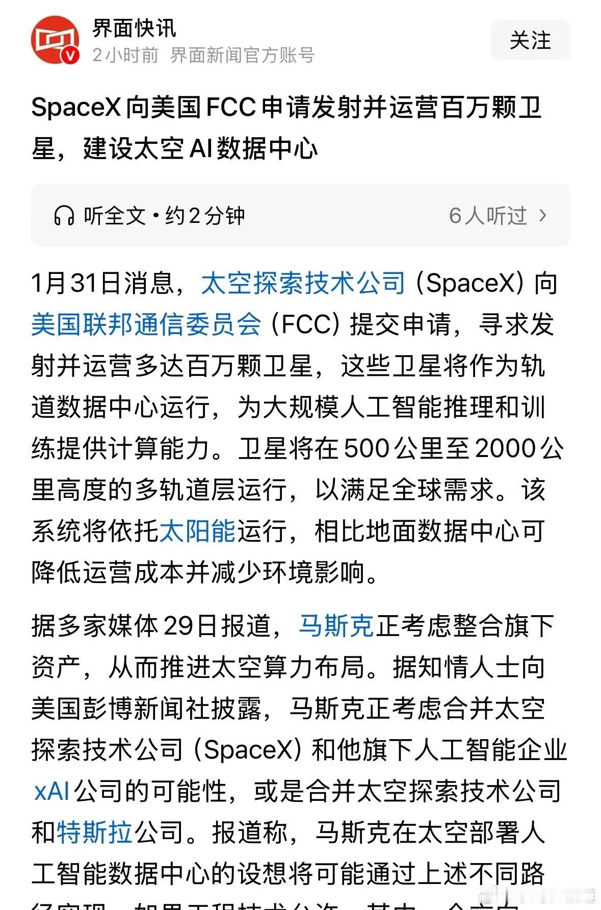 商业航天和算力CPO板块周末突发重磅利好消息,马斯克申请运营百万颗卫星下周如何影响A股:马年投资就看马斯克,他又有大动作!1月31日这个周末本来商业航天龙头股业绩不行,但是刚刚,周末突发重磅利好消息,马斯克的SpaceX申请运营百万颗卫星,建设太空算力中心,这对商业航天和算力CPO板块都是利好消息,因为中国20万颗还算少了!如果下周商业航天有低开或者杀跌机会,倒是可以看看底仓博短线反弹。你觉得呢?但预计整个航天板块个股也会分化了,尽量选择下跌到位的龙头股,以低吸为主,不宜追高,整体看商业航天板块短期还是调整趋势,点赞关注验证。