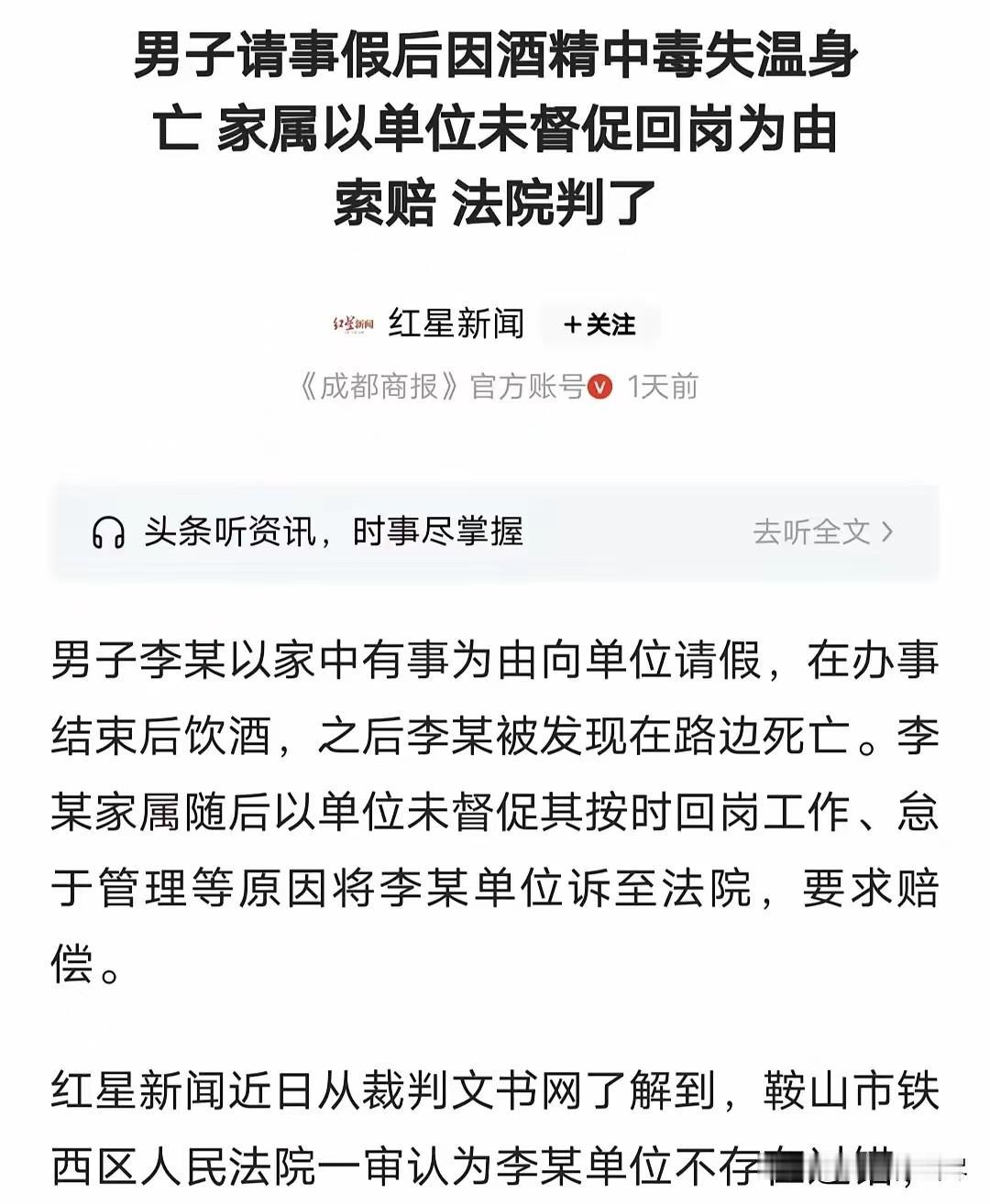 讹天讹地讹空气!”辽宁鞍山,男子跟单位请假,说家里有事,单位批准。次日,男子被人发现死在路边,经鉴定是酒精中毒失温死亡, 不料,家属怪单位没打电话问问男子的情况,没催他到岗,间接导致男子死亡,要求单位赔偿。单位喊冤:他还没到返岗时间呢,我们无权干涉他个人活动,法院判决亮了。 事情发生在去年2月的鞍山,男子李某在当地一家科技公司上夜班,日常工作时间从傍晚持续到次日清晨。那天傍晚6点多,李某按时到岗打卡,换上工装后没多久,就找到班长说家里有急事需要处理,申请临时请假。 班长了解情况后,按照公司流程批准了他的事假,明确请假时间从当天18时20分至第二天7时30分,刚好衔接上他的下一个班次,李某收拾好个人物品后便匆匆离开了单位。 谁也没想到,这竟是李某与单位的最后一面。次日凌晨5点左右,天还没亮,有路人在城郊一条僻静的路边发现了倒在地上的李某,当时他浑身冰冷,已经没了生命体征。 路人立刻拨打了报警电话,警方赶到后封锁了现场,经过初步勘查排除了他杀嫌疑,随后将李某的遗体送往专业机构进行鉴定。 鉴定结果显示,李某体内酒精含量严重超标,结合当时夜间低温的环境,最终判定其死亡原因是酒精中毒引发的失温身亡。 这个结果让李某的家属难以接受,悲痛之余,他们将目光投向了李某的单位,认为单位应当为李某的死亡负责。 在他们看来,李某从离开岗位到被发现死亡,中间长达8个多小时,单位既没有打电话给李某询问情况,也没有督促他按时回岗,这种“怠于管理”的行为间接导致了悲剧发生,于是向单位提出了赔偿要求。 面对家属的索赔,单位觉得十分冤枉。公司相关负责人表示,李某是按正常流程请假,且请假时间尚未结束,不存在“超时未返岗”的情况,单位没有权利也没有义务干涉员工请假期间的个人活动。 员工在私人时间里的行为,完全由其自身负责,李某饮酒导致意外身亡,与工作没有任何关联,单位不应承担赔偿责任。双方协商无果,家属最终将单位诉至鞍山市铁西区人民法院,希望通过法律途径索要赔偿。 法院受理案件后,对事件的全过程进行了详细调查,调取了公司的请假记录、考勤表,以及警方的勘查报告和法医鉴定意见书。 庭审中,家属坚持认为单位存在管理疏漏,没有尽到对员工的关怀义务,而单位则提交了完整的请假审批流程证明,辩称对员工请假期间的个人行为无管控义务。 结合双方提交的证据和相关法律规定,法院经审理认为,侵权责任的构成需要满足过错、损害结果、因果关系等要件。 本案中,李某的死亡原因是酒精中毒失温,属于自身行为导致的意外,其请假期间的活动与工作内容无关,单位在批准请假的过程中没有任何违规操作,也不存在过错。 员工请假后,单位对其个人生活并不负有监督或关怀的法定义务,李某的死亡与单位的行为之间没有直接的因果关系,因此家属要求单位承担赔偿责任的诉求缺乏法律依据。 最终,法院一审判决驳回了李某家属的全部诉讼请求。这个判决结果引发了网友的广泛讨论,有人支持法院的判决,认为家属的索赔确实不合理, 不能把个人行为导致的后果强加给单位;也有人觉得家属只是过于悲痛,才想找个渠道寻求慰藉,但法律讲究证据和因果关系,不能凭情感判断责任。 法律界人士也对此类情况进行了科普,员工请假期间若因自身疾病、个人意外等非工作原因死亡,且单位在请假流程上无过错,通常无需承担责任; 只有在员工因工作相关事宜请假、或单位存在明显过错的情况下,才可能需要承担相应责任。这起案件也给大家提了个醒,遇事需理性看待,不能盲目索赔,法律会对各方的权利义务作出公正界定。 对此,你们有什么看法,欢迎评论留言~