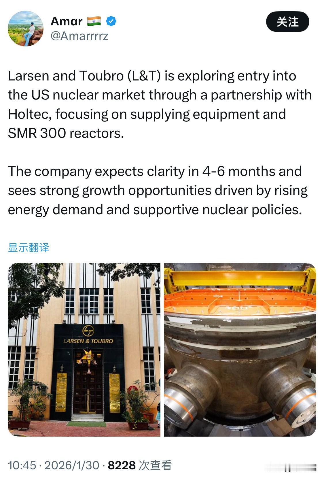 根据 2026 年 1 月底的最新进展,印度拉森图博 公司(Larsen & Toubro, L&T) 正积极通过与美国能源解决方案供应商 Holtec International 合作,探索进入美国核能市场的机会。 合作核心:双方已签署谅解备忘录 (MoU),L&T 将利用其核能制造能力与 Holtec 的设计专长相结合,重点供应换热设备及 SMR-300 小型模块化反应堆。 准入许可:L&T 已获得美国能源部 (DOE) 的 810 授权,这为其在美国市场供应关键核能组件扫清了障碍。 时间表:L&T 能源业务负责人 Subramanian Sarma 表示,公司预计在接下来的 3-6 个月内 情况将进一步明朗 增长动力: 电力需求激增:特别是 AI 数据中心和基础设施建设带动的用电需求,使得 SMR 成为极具吸引力的零碳能源方案。 政策支持:美国政府正大力推动核能复兴;同时,印度通过的《SHANTI 法案》消除了民事赔偿责任顾虑,增强了私营部门参与核电项目的信心。