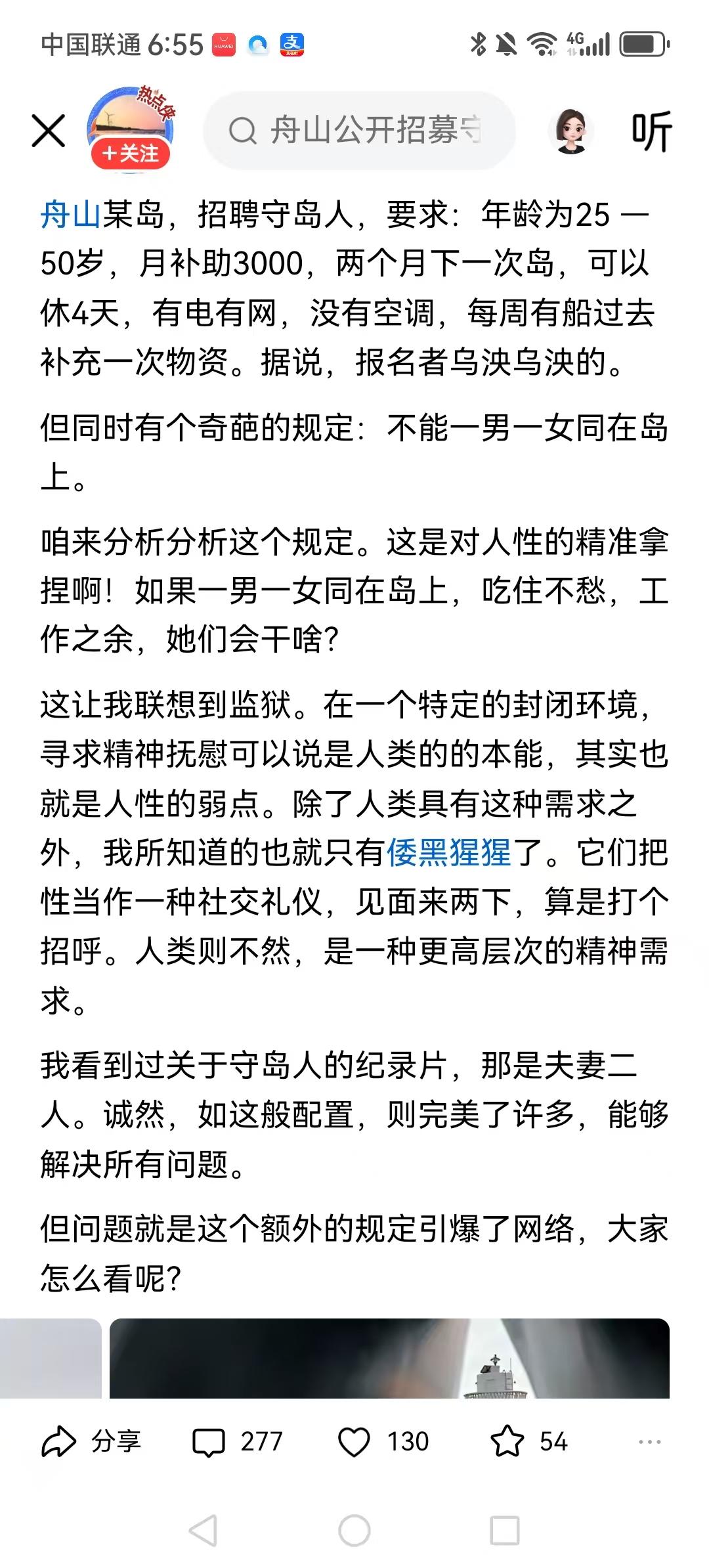 不能一男一女,是对人性的精准拿捏。刘烨演了一部电影,两口子守岛的事。光秃秃的海岛上,不要觉得有什么海岛风光,更多的是寂寞、缺水、缺电、缺食品、缺一切生活所需,非常艰苦的。 没事,这生活我经历过,10年前我在非洲生活工作过程中,经常需在那些贫穷国家的小城镇独立生活,慢慢适应也没感觉啥。 一男一女的话,几年以后岛上就是一群人。 一个孤岛,一男一女不会生出很多孩子的,现在也是两个人守着一个空房,也没生出一群孩子。 空房太小,容不了多少孩子,孤岛大,可容一堆孩子。 我一个人在出租屋已经呆了快一年了,除了每周下楼去买点吃用来做饭,就不再下楼了。 这么多人不问个关键的问题,工作量大不大,想去享受孤独,工作量大了就没有享受只有苦。
