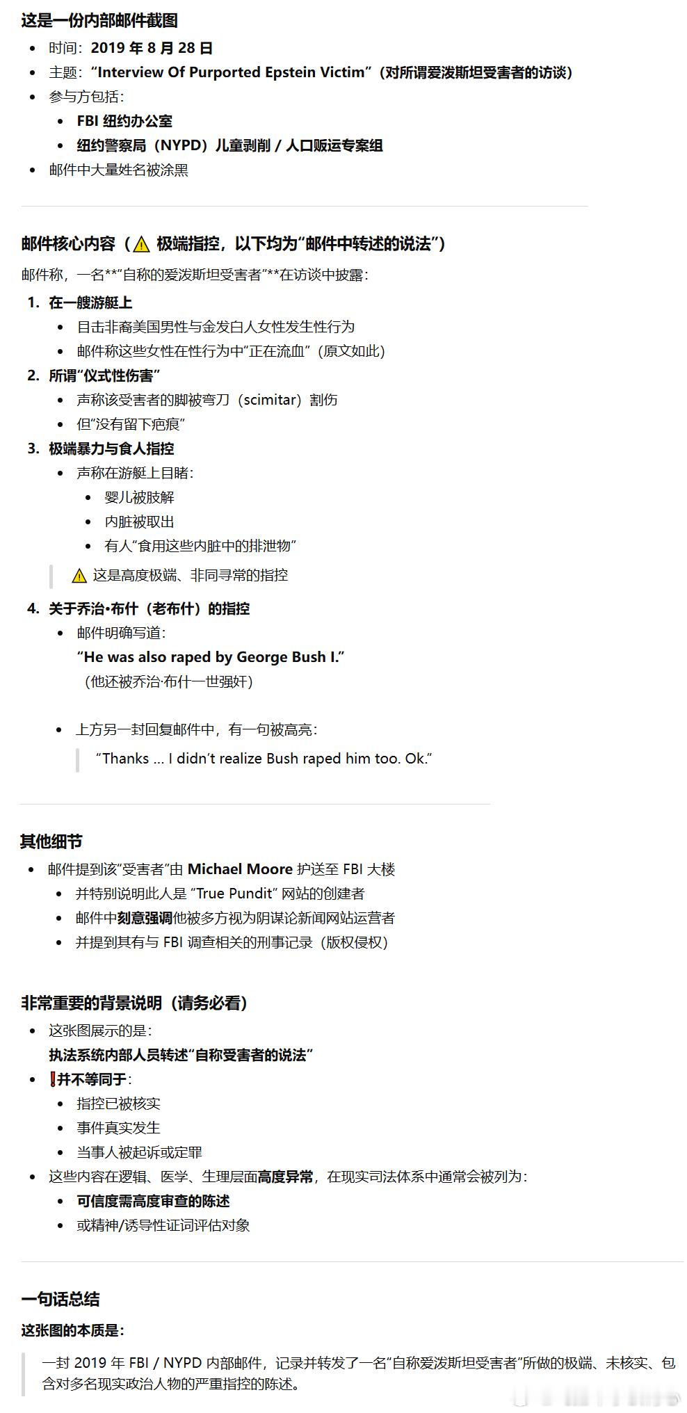 “一封 2019 年 FBI / NYPD 内部邮件,记录并转发了一名‘自称爱泼斯坦受害者’所做的极端、未核实、包含对多名现实政治人物的严重指控的陈述。”