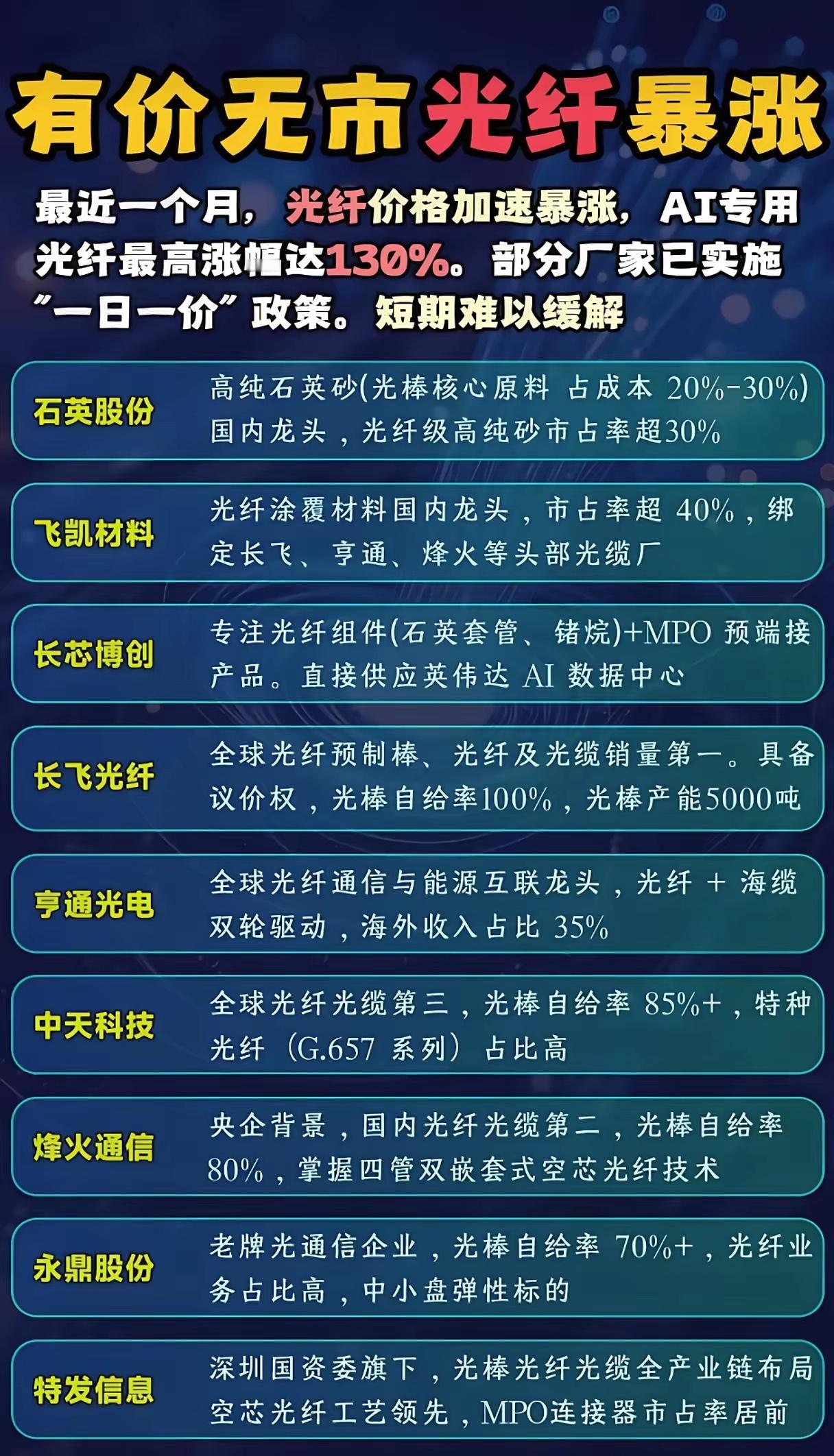 光纤暴涨130%,9家概念核心公司的黄金时代真的来了?当AI专用光纤在一个月内飙涨130%,当部分厂家祭出“一日一价”的硬核策略,我们不禁要问:这场有价无市的暴涨,是否正在宣告AI算力基建的黄金时代已经来临?这波行情绝非偶然。随着大模型训练与推理需求的指数级增长,全球数据中心正经历一场“光进铜退”的革命。AI专用光纤作为算力网络的“神经网络”,其需求爆发直接源于GPT-5、Gemini等新一代AI模型对带宽的极致渴求。长芯博创为英伟达AI数据中心直供的MPO预端接产品,正是这场技术军备竞赛的缩影。当每一台AI服务器都需要数倍于传统服务器的光纤连接,供需失衡的火药桶早已埋下。在这条黄金赛道上,中国企业展现出全产业链的硬核实力。石英股份作为光纤级高纯砂的国内龙头,市占率超30%,牢牢卡住了光棒生产的源头;飞凯材料的光纤涂覆材料绑定长飞、亨通等头部企业,市占率超40%,构筑起坚实的技术壁垒;长飞光纤以全球第一的光棒产能,掌握着行业定价权,其100%的光棒自给率成为应对涨价潮的压舱石。更值得关注的是,这场涨价潮正从国内蔓延至全球。亨通光电35%的海外收入占比,折射出中国光纤企业在全球市场的话语权;烽火通信的空芯光纤技术,代表着下一代通信介质的发展方向。当OpenAI、微软等科技巨头持续加码算力投入,中国光纤企业凭借技术积累与产能优势,正成为全球AI基建浪潮的关键受益者。不同于过往周期的炒作,这轮行情有着坚实的基本面支撑。AI算力需求的爆发式增长,并非短期脉冲,而是长达数年的技术革命。从石英砂到光棒,从光纤到连接器,全产业链的量价齐升,正在重塑光通信行业的估值逻辑。长飞光纤、亨通光电等龙头企业,不仅将享受涨价红利,更将在全球算力基建的竞赛中抢占先机。当“东数西算”工程与全球AI浪潮形成共振,中国光纤产业正站在历史的风口。这场130%的暴涨,不仅是市场情绪的宣泄,更是对AI算力基建时代的提前投票。我们有理由相信,在这场技术革命中,中国光纤企业将凭借全产业链优势,书写属于自己的高光时刻。