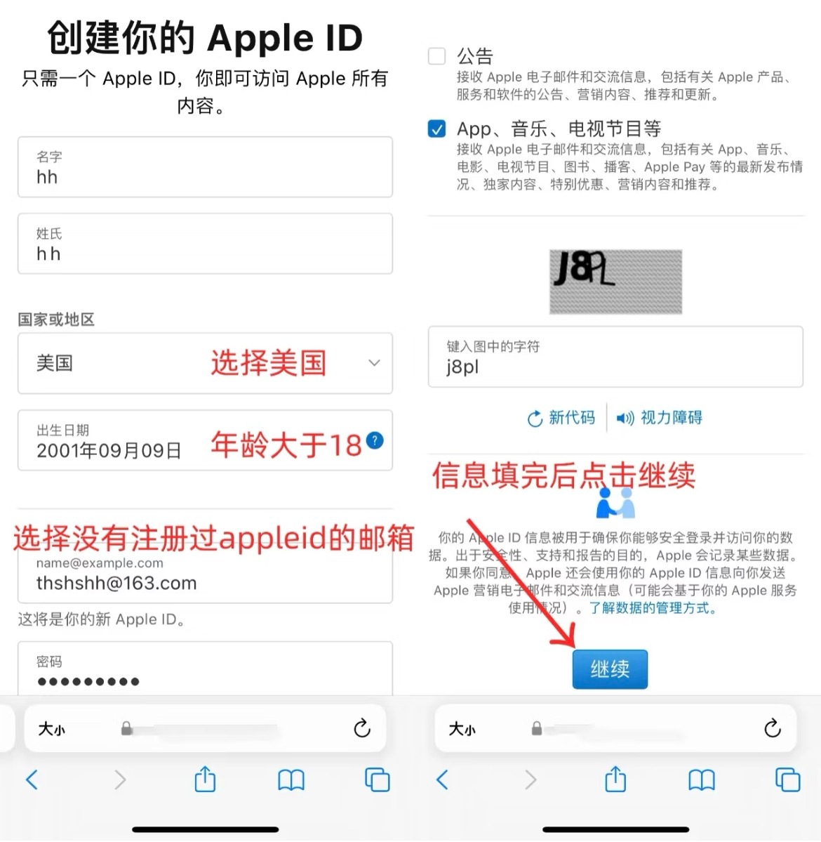 第二步:美区ID(这次如果不想弄也可以直接找我要,但我还是建议自己搞一个,找我要的可以直接跳过这一步)1️⃣首先在Safari里搜索苹果官网:网页链接2️⃣右上角这个购物袋子点击登录(如果他问你要不要用你本机的appleid登录,就选择使用其他账号) 见图四 3️⃣然后图五 这个地方选择创建账户4️⃣点完创建就填信息,这个地方的截图我直接拿📕飞不倦的鸟这个博主的来说了,记得地区选美区,验证完就创建完了 见图六 5️⃣打开appstore,点击右上角的小头像划到最底下,点退出登录,然后登录你刚刚创建的美国ID(这个时候还没转换成美区),登录之后再次点开小头像,再点图七 这个地方6️⃣换区,你们这个地方初始应该是中国大陆,点击一下找到美国然后切换(这一步要连美国节点的🪜,这样后面选付款方式的时候可以选无) 见图八 7️⃣填写资料这一步如果没有连🪜会出现图九 上面这种只有借记卡和PayPal的选项,连了🪜就会多出现一个无的选项,选择无,然后填写账单寄送地址,所有的信息都可以直接抄图九 下面的8️⃣完成以后美区ID就转换成功了,可以搜索TIKTOK然后下载‼️哪一步卡住的可以直接来问我‼️