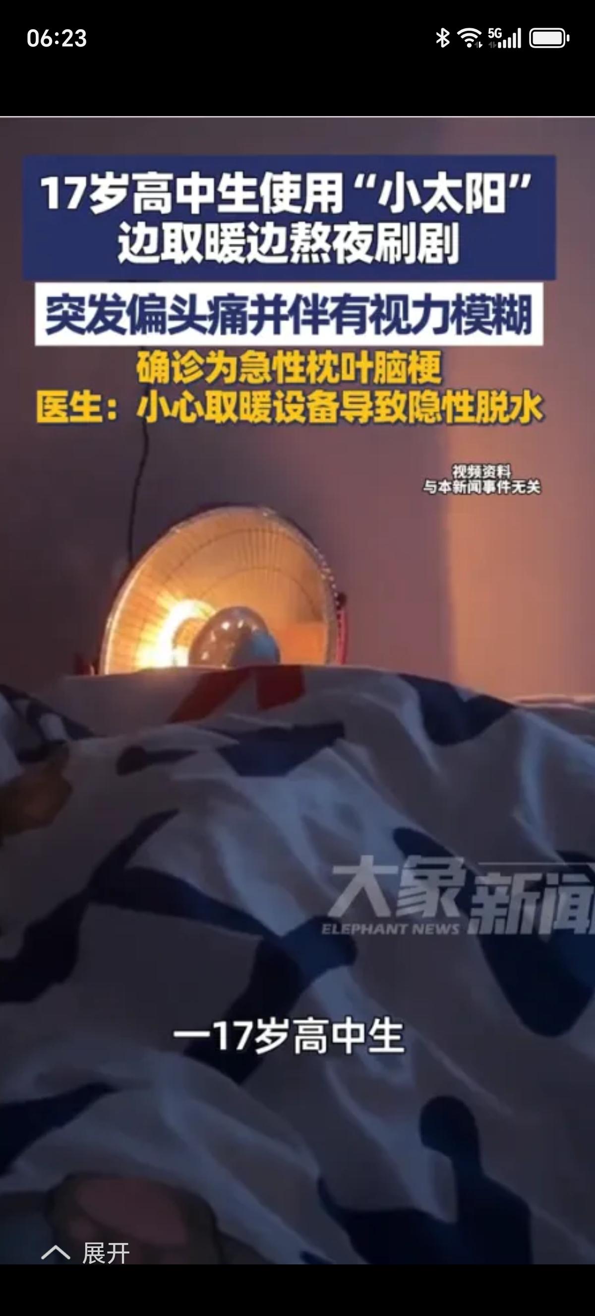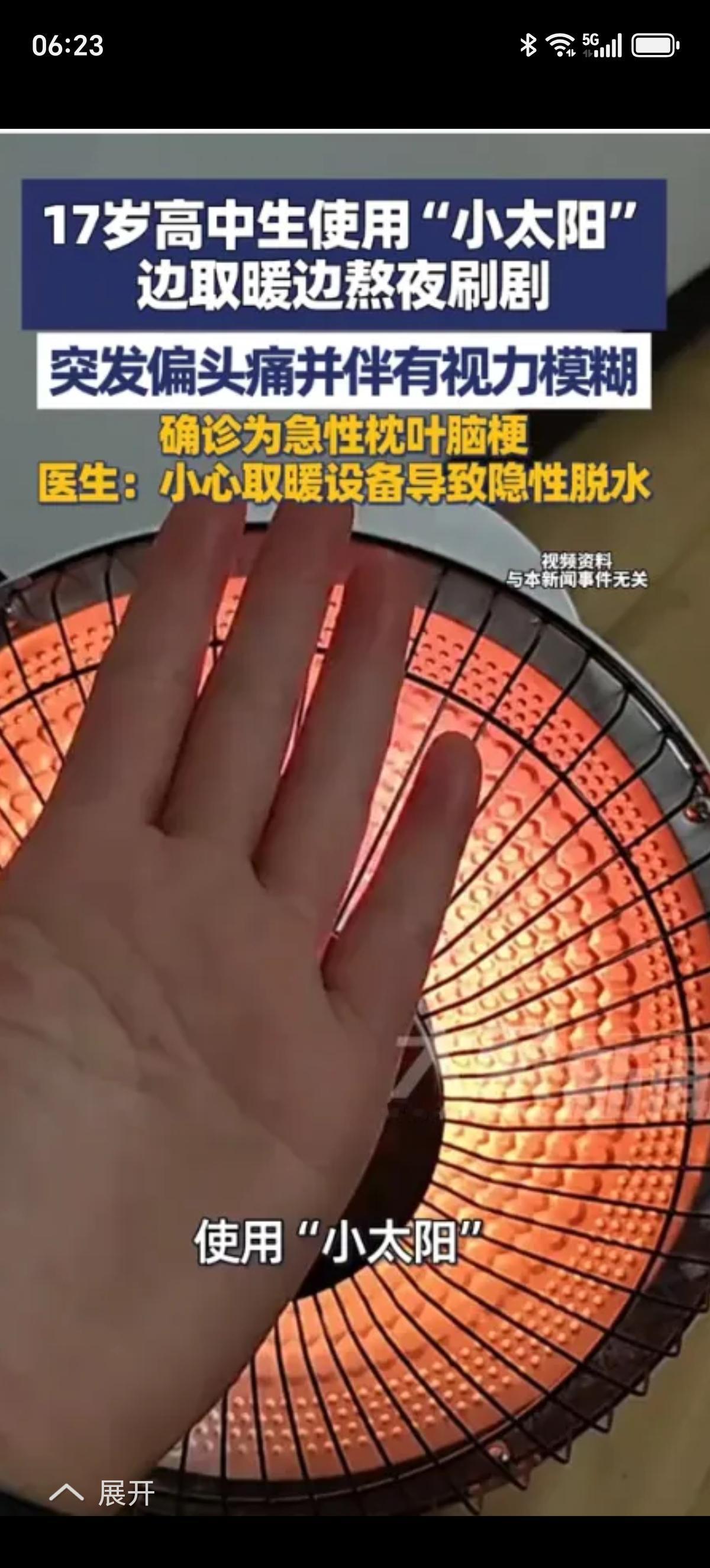太可怕了! 烤个“小太阳”怎么能引发脑梗呢? 1月29日(报道)福建,17岁高中生使用“小太阳”,边取暖边熬夜刷剧,突发偏头痛并伴有视力模糊,确诊为急性枕叶脑梗。 医生提醒:小心取暖设备导致隐性脱水,使用取暖设备时,一定要保持室内通风,每小时补充一次水分,避免长时间近距离直吹,防止“隐形脱水”引发的健康危机! 不是小太阳的问题吧,是他长时间不喝水的问题,大家一定要注意安全。