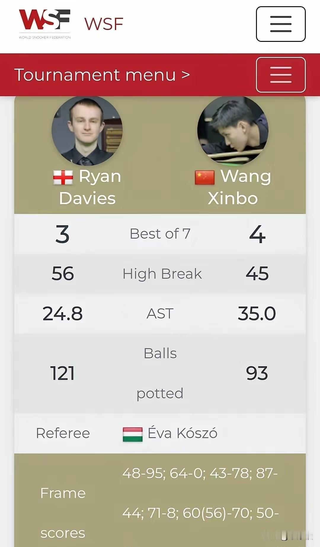 WSF锦标赛,今天王信伯与哈马德·米亚赫争夺冠军。冠军将获得一个职业席位。米亚赫曾经是职业选手,实力较强,王信伯必须全力以赴。 从191名选手中脱颖而出,一直打到决赛,真不容易。中国小将王信伯昨晚在半决赛中4-3逆转绝杀瑞安·戴维斯,晋级决赛,今天将与哈马德·米亚赫争夺冠军。米亚赫昨晚4-0零封卡林顿,率先晋级决赛。 王信伯与戴维斯的半决赛赢得非常惊险。戴维斯攻防两端实力都很强。第6局,2-3落后的王信伯70-60逆转,3-3艰难扳平比分。决胜局,王信伯62-50险胜。 WSF锦标赛的冠军奖金虽说有1万英镑,但重点却是职业资格。按照规则,WSF锦标赛冠军将获得为期两年的职业资格。 决赛采用9局5胜,王信伯,加油!
