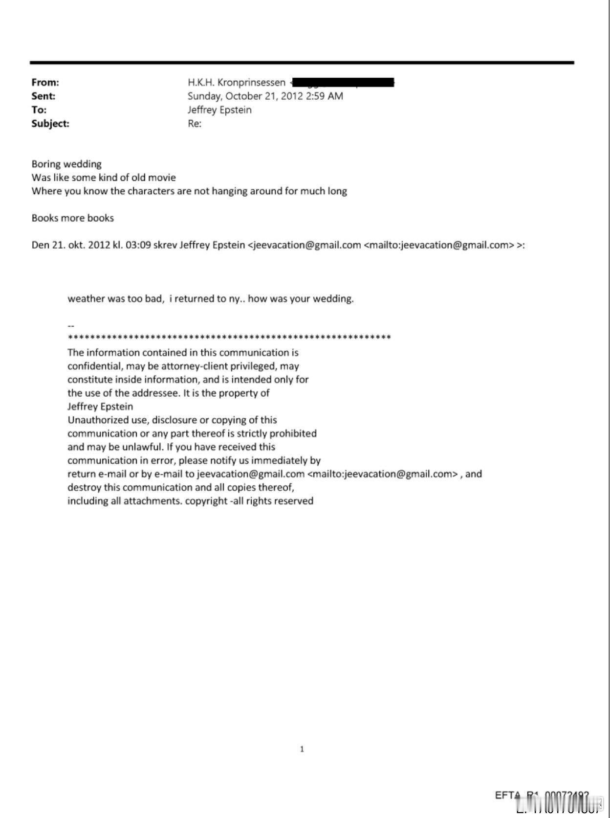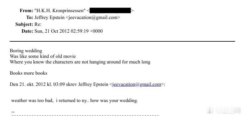 挪威王室 ⚡⚡⚡🇳🇴爱波斯坦大瓜继续:挪威王储妃梅特-玛丽特在2012年10月21日发送给爱波斯坦的邮件中表示,卢森堡大公储纪尧姆和大公储妃斯蒂芬妮的婚礼无趣令人厌倦,就像一部老电影。你知道这些角色不会待太久。王储妃这辈子还准备去卢森堡吗???人家卢森堡啥时候惹你了。。。世界各国王室新闻 怪不得出席婚礼,她穿的像乌鸦风格。