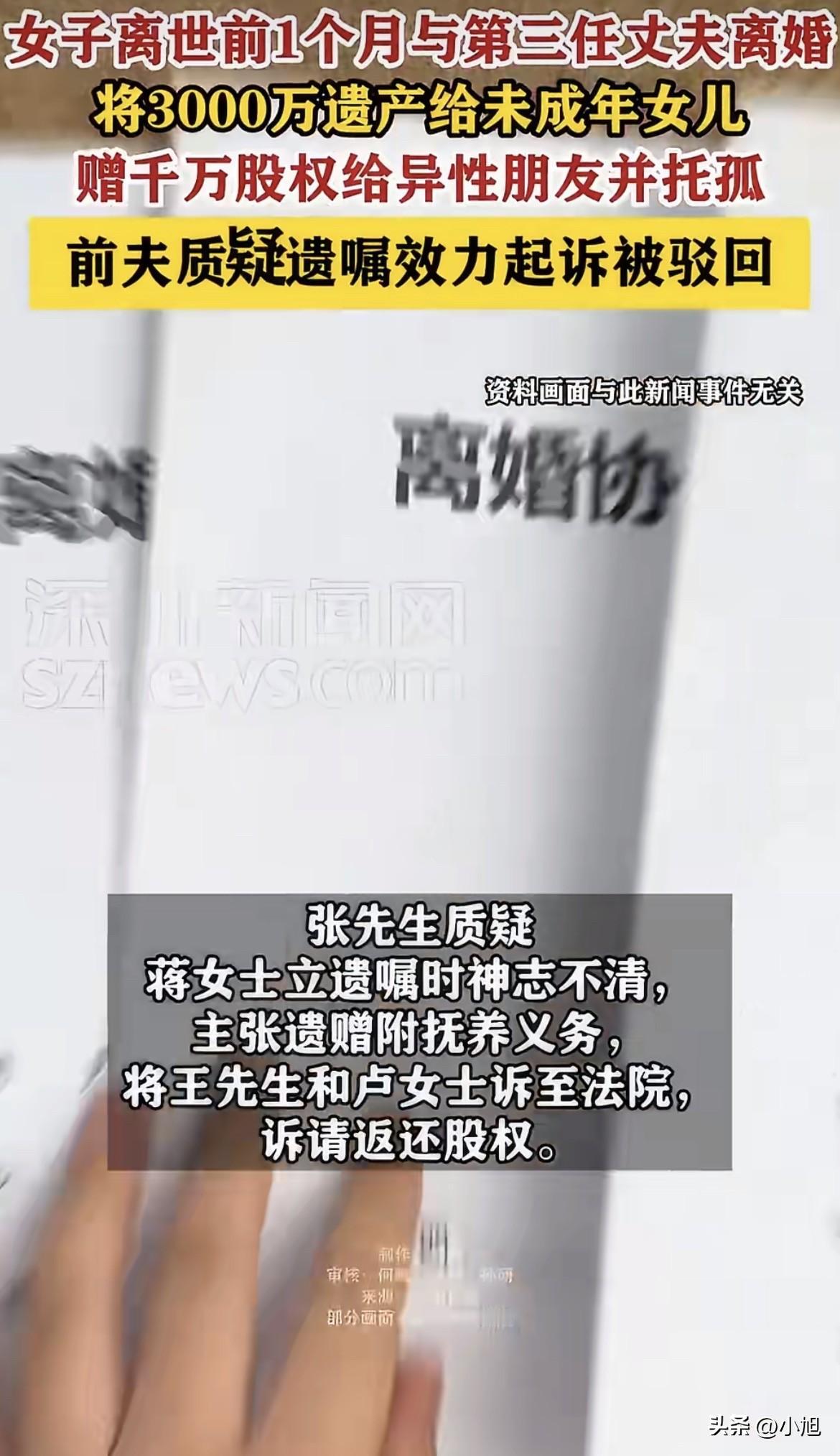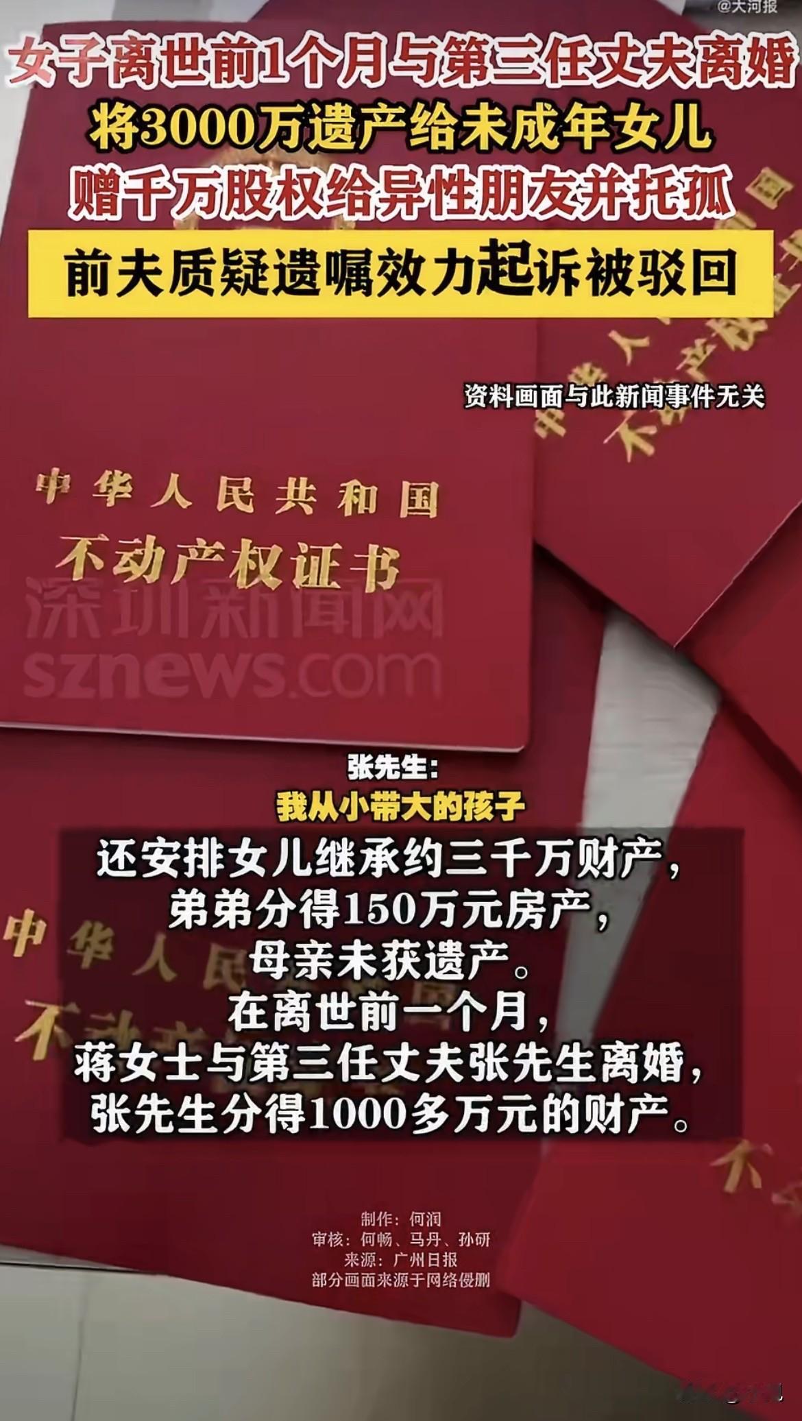 一个深圳母亲,在生命最后几个月里,做了一连串让身边人都看不懂的安排。先是把公司股权全给了认识十五年的异性朋友,又把三千万遗产留给女儿,还赶在离世前一个月和丈夫离了婚。等她因卵巢癌去世后,一场官司在所难免。 这位母亲姓蒋。在她离世前不到一个月,2023年3月6日,她和第三任丈夫张先生离了婚。根据协议,两个女儿归蒋女士直接抚养,张先生不用付抚养费。财产上,张先生分到了深圳的三套房子、惠州一套房,外加230万现金补偿,按他说法,总价值超过一千万。那时,蒋女士的生命已经进入倒计时。 更早一些,在离婚前一个多月,2023年1月30日,蒋女士做了一件更重要的事:她去立了一份公证遗嘱。遗嘱里写明,把她名下三家公司的股权,全部送给一位朋友王先生。王先生是她生意上合作了十五年的伙伴。她在遗嘱里写:“我希望,在我去世后,王先生能在力所能及的范围内尽量照顾我的两个未成年女儿至成年,给予她们爱和关心、引导。” 但这份公证遗嘱上,同时也注明了“无附加条件”。 就在离婚前一天,蒋女士又写下一份自书遗嘱,指定王先生是两个女儿的第一顺位监护人,她自己的表妹是第二顺位。到了离世前几天,她再指定王先生的妻子卢女士,作为遗嘱执行人。也就是说,女儿们继承的价值三千万的房产和存款,要等到22岁才能动用,期间由卢女士管理。 蒋女士没有给自己的母亲留遗产,只给弟弟分了一套价值约150万的房产。这一切安排,张先生是在蒋女士去世后才知道的。他最无法接受的,就是女儿的监护权问题。“两个女儿是我与蒋女士的法定女儿,却将监护权交到了王先生手中。” 虽然实际上,女儿们在母亲去世后几天,就由张先生抚养了。 张先生对这份遗嘱的合理性提出了强烈质疑。他出示了一份2017年的打款记录,附言写着“蒋某某严重精神障碍患者监护人补贴”。他认为蒋女士立遗嘱时可能神志不清。不过,法院向深圳市康宁医院调取的病历显示,蒋女士在2015到2022年间就诊过12次,诊断包括“焦虑抑郁状态”“双相情感障碍?”等。而蒋女士本人在遗嘱开头明确写道:“本人书写本遗嘱时神志清醒,本遗嘱是我本人的真实意思表示。” 2025年,张先生以自己和两个女儿的名义,把王先生和卢女士告上了法庭。他的核心主张是,那份股权遗赠是“附义务的”,义务就是王先生要抚养两个女儿成年。他认为遗嘱里的“希望”不是随口一说,而是“恳切的要求”,具有法律约束力。他甚至提出,如果巨额遗赠给异性朋友却没有特殊理由,那要么不合常理,要么可能涉及不正当关系。 张先生的诉讼请求非常具体:要求王先生把已经过户的三家公司股权还回来,或者支付380万股权收益;还要求王先生按月支付高额抚养费、房屋按揭款,甚至一笔名叫“监护风险成本”的钱,总计每月高达十几万元。 法庭上,王先生和卢女士的答辩很明确:遗赠是遗赠,监护是监护,这是两份独立的遗嘱。公证遗嘱上白纸黑字写着“无附加条件”,“希望照顾子女”只是情感上的嘱托,不是法律义务。他们认为张先生是在滥用诉权。 法院今年1月的判决,完全采纳了王先生方的观点。法院认为,关键在于,蒋女士在指定王先生为监护人的那份遗嘱里,“完全未提及遗赠的相关内容”。两份遗嘱是独立的,法律上看不出“拿了股权就必须养孩子”这种捆绑条件。因此,法院驳回了张先生的所有请求,7万多元的案件受理费也由他承担。判决书里还提到,其中一家公司股权,早在2023年4月,蒋女士去世几天后,就已经变更到王先生名下了。 在另一份相关的判决里,法院虽然认定张先生是孩子的法定监护人,但也明确驳回了他想撤销卢女士遗产管理人资格的请求,再次认定蒋女士的所有遗嘱都合法有效。 拿到判决书后,张先生说他还会继续寻求法律途径。这场纠纷,表面争的是股权和抚养义务,内里却是一个母亲在生命尽头,对自己身后事极其复杂又清醒的布局。她把巨额财产留给了女儿,却把最能赚钱的公司股权,连同一份沉甸甸的“希望”,托付给了老朋友。她给了前夫足以安身立命的房产,却把孩子的未来,交付给了自己更信任的人。 你怎么看这位母亲最后的选择?如果是你,又会怎么做呢?