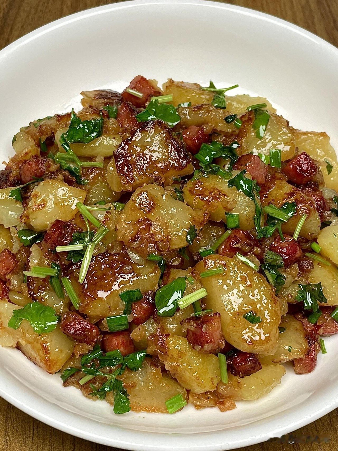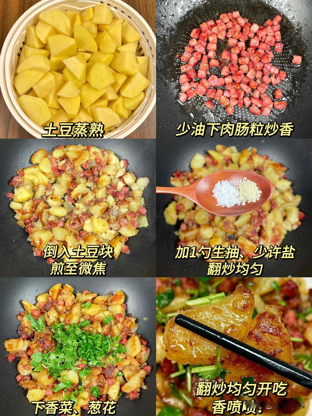 被网友的土豆炒肉肠配方封神了! 家人们谁还没试过这个做法! 真的香到舔盘! ❶土豆切块蒸熟 ❷少油炒香肉肠粒, ❸倒入土豆煎到微焦。 ❹加1勺生抽+少许盐, ❺撒上香菜葱花。 ❻翻炒均匀,开吃 土豆外焦里糯, 肉肠一口爆汁, 咸香入味超下饭。 简单几步零失败, 厨房小白也能拿捏! 真心建议大家冲, 拌米饭我能炫两大碗!