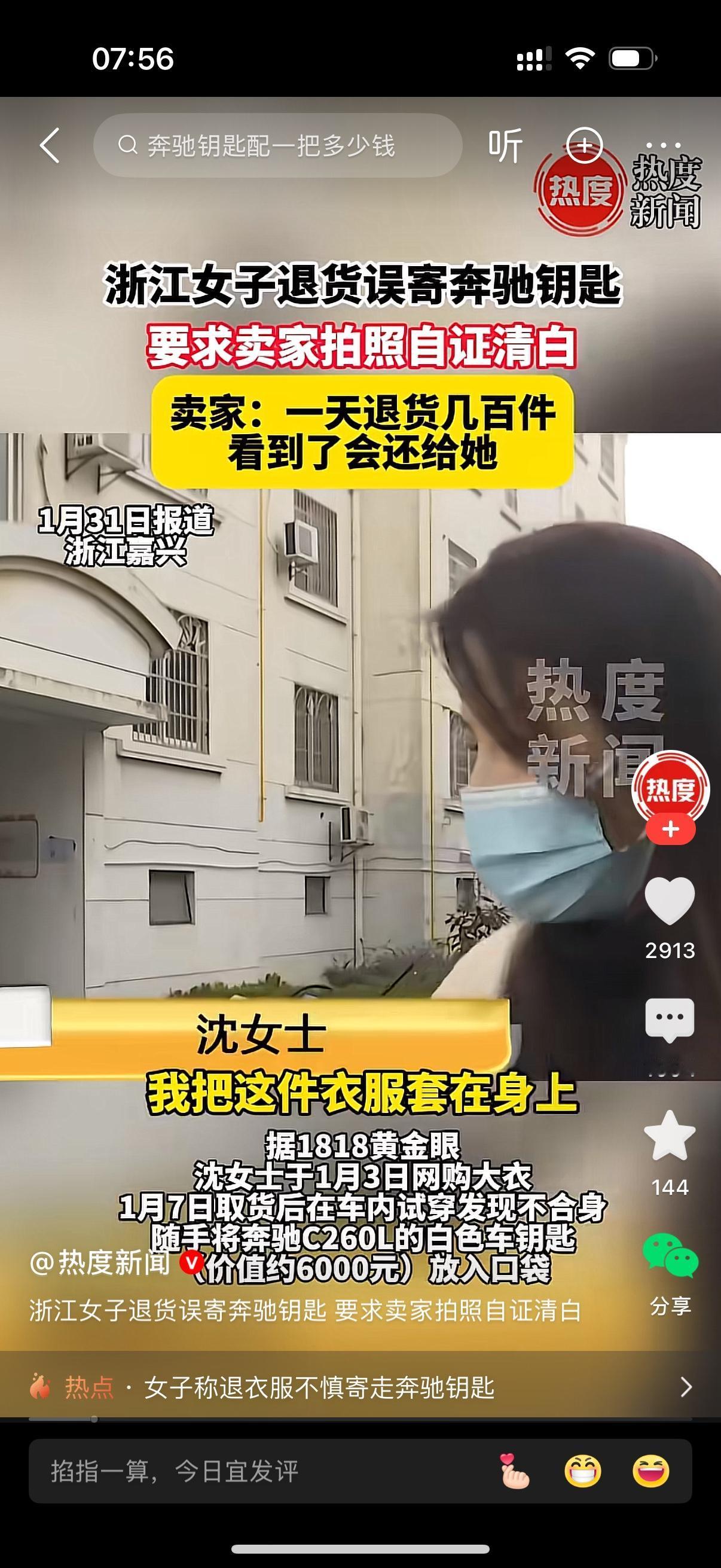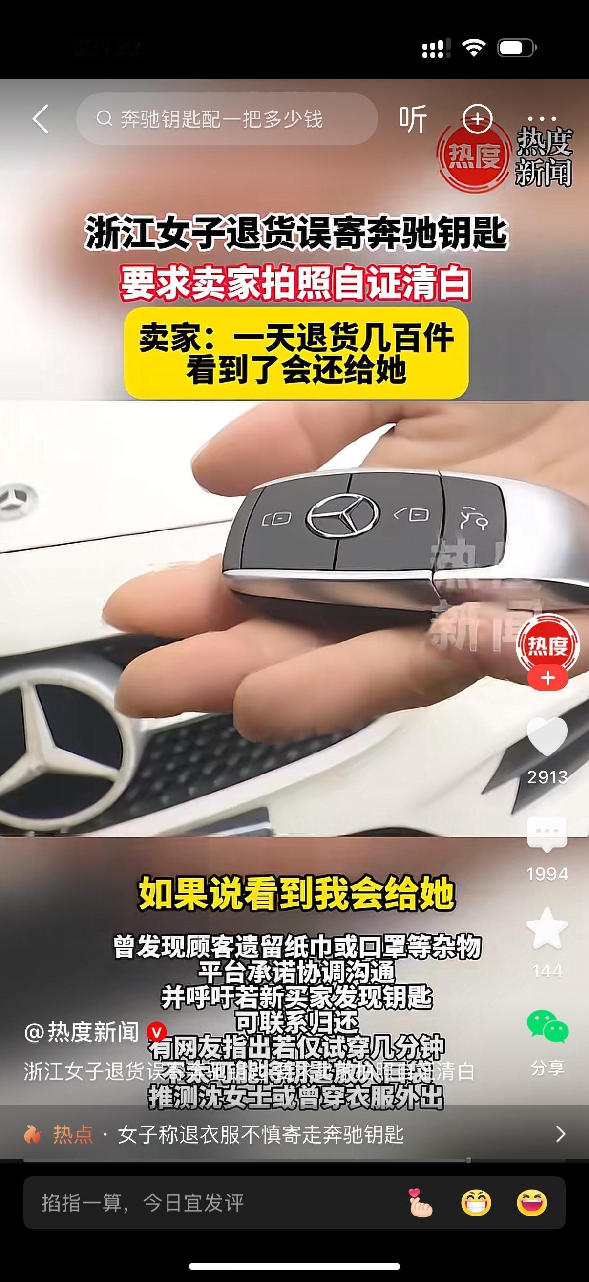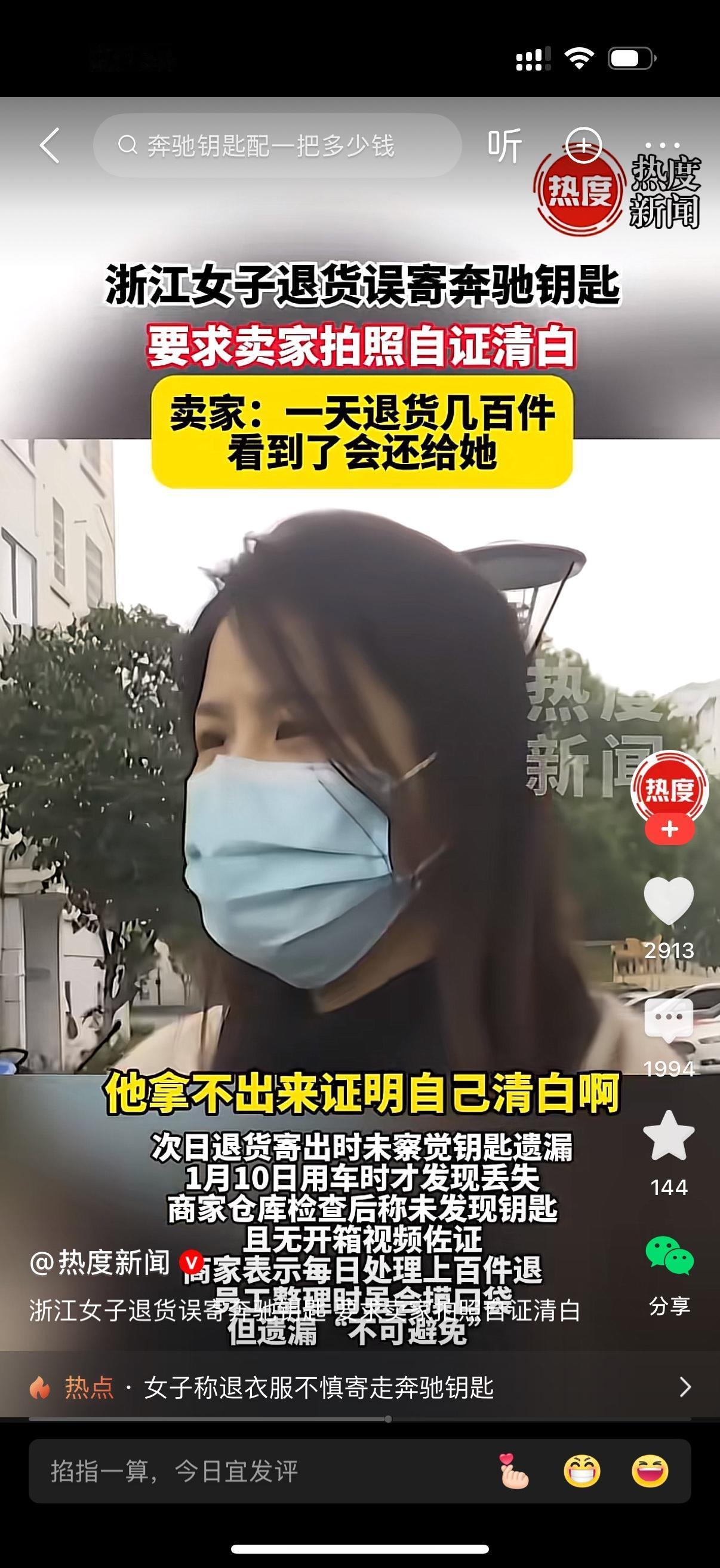 女子说自己试穿衣服的时候,随手就把奔驰车钥匙放衣服口袋里了。现在衣服退回给商家了,钥匙却找不到。女子说商家就直接回复自己没有。女子质疑,入库视频没有,开箱视频没有,商家拿不出证据证明自己的清白啊?商家说自己每天退货上百件,如果看到会给她。这个钥匙拿了也没用。这个女子不厚道,哪个试衣服会往口袋装钥匙?你肯定是穿出去了。穿了再退,不膈应人嘛。现在钥匙丢了,你还让别人举证?谁主张谁举证,不知道吗?
