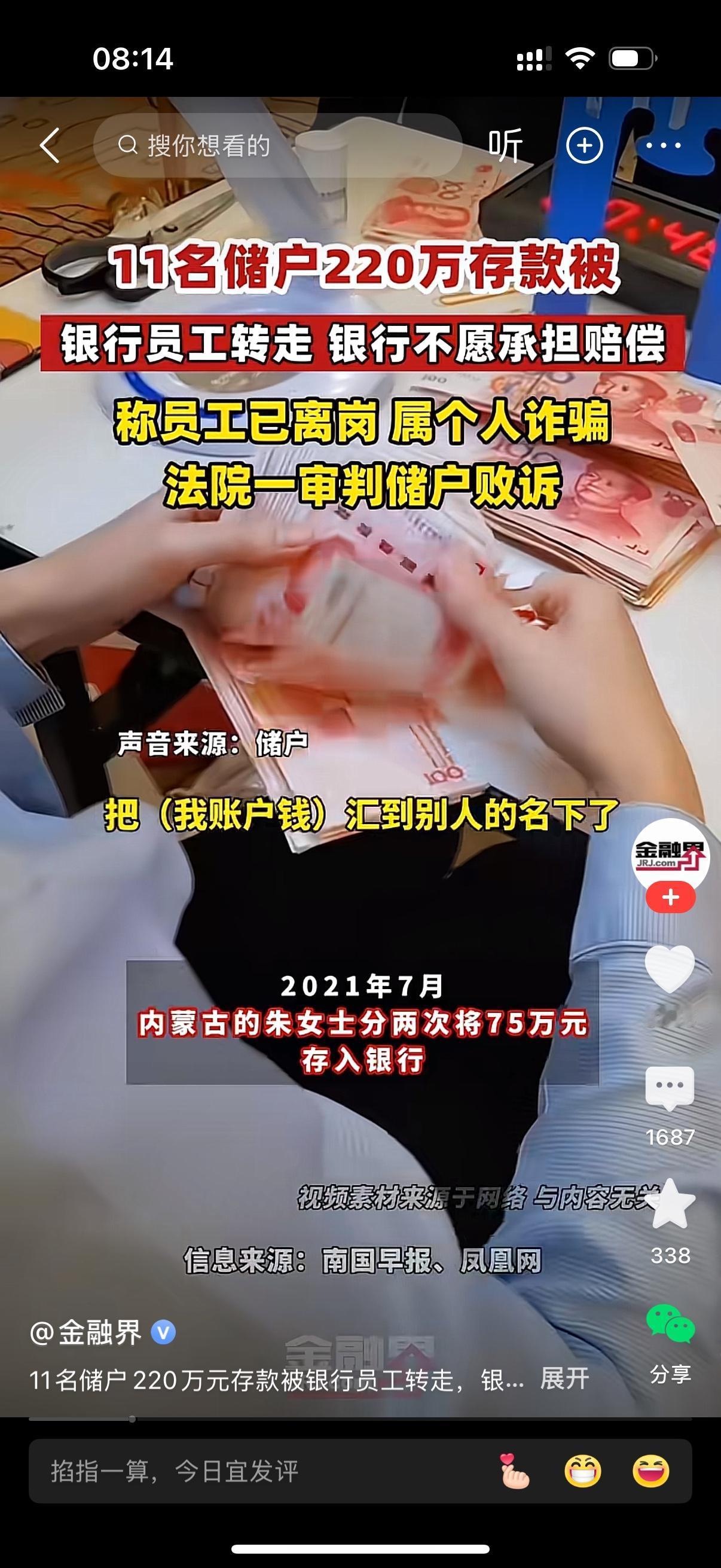 11名储户存款220万被银行员工转走。银行不愿承担赔偿。银行称员工已离职,属于个人诈骗。这11名储户的存款都是入账后就被那个银行员工转存到他人名下了。11名储户起诉银行,要求支付本金及利息,法院一审判他们败诉。现在看来,钱放在银行也不是很安全了。