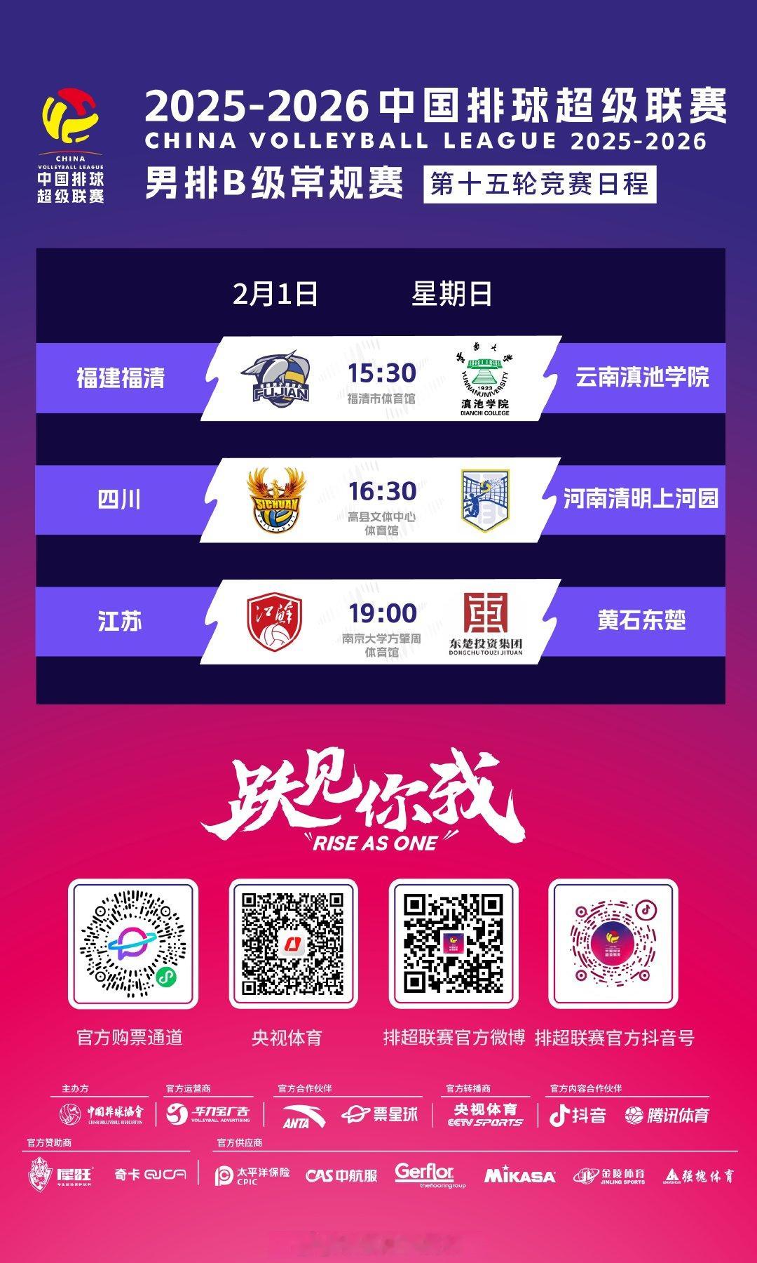 2025-2026中国男排超级联赛 A级常规赛第14轮、B级常规赛第15轮今天上演,具体的竞赛日程是: