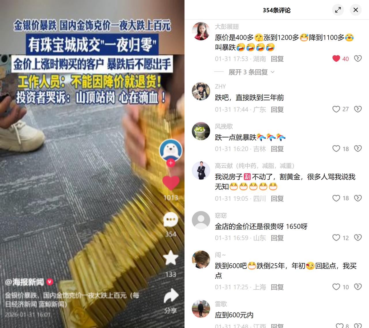 金价暴跌,有人山顶站岗要退货 现货黄金单日暴跌超9%创40年纪录,国内金饰价跟着跳水百元,但之前高位入手的消费者要求退货遭拒,不少珠宝城直接成交停滞,舆论吵成一团。 这事看着是消费者亏急了眼,实则揭开了金饰行业的老规矩。大家骂跌了还是贵,并非没道理,品牌金饰每克比基础金价溢价400-550元,回收时不仅工费全损,品牌溢价也一文不值。更关键的是跟涨不跟跌的潜规则:国际金价暴涨时,零售端蹭蹭涨至1700+;暴跌时却跟跌慢、幅度小,溢价始终咬得死死的。 很多人买金时以为是抗通胀的硬通货,殊不知商家卖的是带品牌的工艺品。这层窗户纸,非得摔一次跤才能看清?
