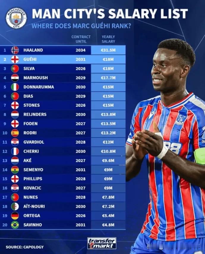 曼城的薪资真是离了大谱,这还不爆?冬窗还又签了俩。光哈兰德一年光工资就得给3个亿啊。感叹有钱真好! 话说这马尔穆什加入是时机太好了,不然这种二流球员一辈子拿不到这种高薪,而格伊是把签字费也平摊到工资了吧?如果光工资,他不是周薪20w? 我估计席尔瓦、斯通斯、阿克今年夏天合同到期了都会走,但福登、罗德里明年合同就到期了,多库格瓦28年,这几位应该都会续约? 有一说一,罗德里大伤后确实不复当年之勇了。