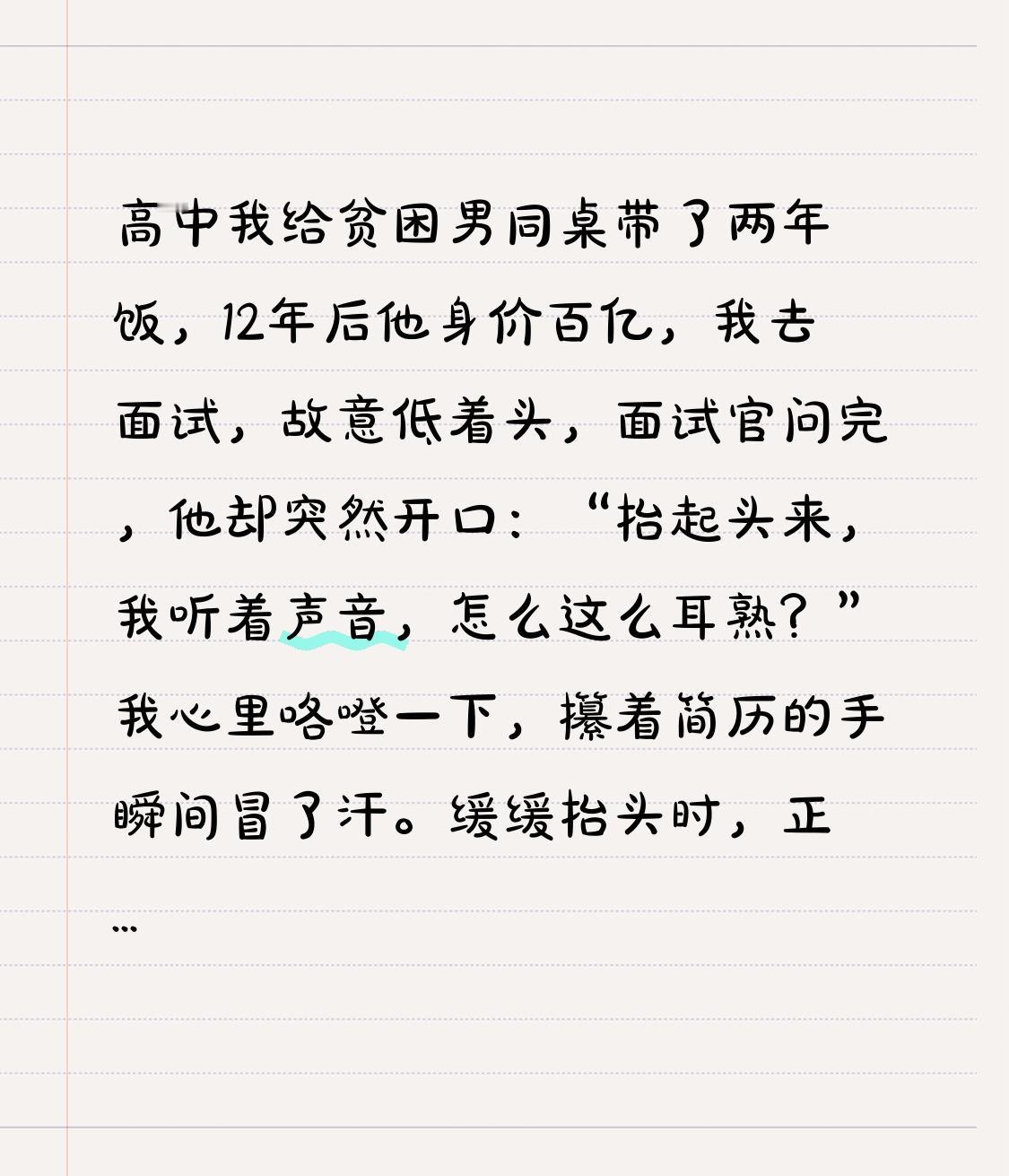 高中我给贫困男同桌带了两年饭,12年后他身价百亿,我去面试,故意低着头,面试官问完,他却突然开口:“抬起头来,我听着声音,怎么这么耳熟?” 我心里咯噔一下,攥着简历的手瞬间冒了汗。缓缓抬头时,正对上那双熟悉的眼睛,眉眼间依稀还是当年那个穿着洗得发白校服的少年模样,只是如今西装革履,周身透着沉稳的气场。他是陆舟,我高中同桌,那个靠着助学金和邻里接济才勉强读完高中的贫困生,也是如今赫赫有名的科技新贵,这家上市公司的创始人。 空气静了几秒,他率先打破沉默,语气平和却带着笃定:“我没认错,你是那个总把饭盒里的鸡腿夹给我的同桌。”我脸颊发烫,忙解释只是举手之劳,怕被人说攀附,他却摆了摆手,目光里满是郑重:“对你是举手之劳,对我是雪中送炭。当年若不是你,我恐怕连一顿饱饭都难有,哪能安心读书考大学。” 面试流程被临时叫停,他留我在办公室单独坐了会儿,书架上摆着一张泛黄的老照片,是高中班级合影,他站在我身边,手里攥着我送他的旧钢笔。“我找了你很多年,”他递给我一杯热茶,“不是想报恩,是想亲口跟你说声谢谢。岗位的事,凭你的能力完全够格,我不会特殊照顾,但会给你最公平的平台。”临走时,他轻声说:“晚上一起吃个饭吧,我请你,就当补回当年你给我带的那些饭。”青春的续写 原创续写 高中续写 素材取于网络