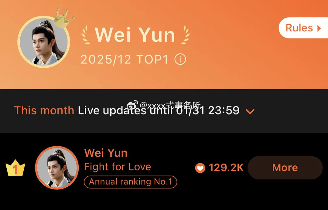 丁禹兮卫韫登顶We TV 香港1月最受欢迎角色榜单TOP 1 ,连续三个月蝉联第一,年榜第一,不愧是wetv全球代言人