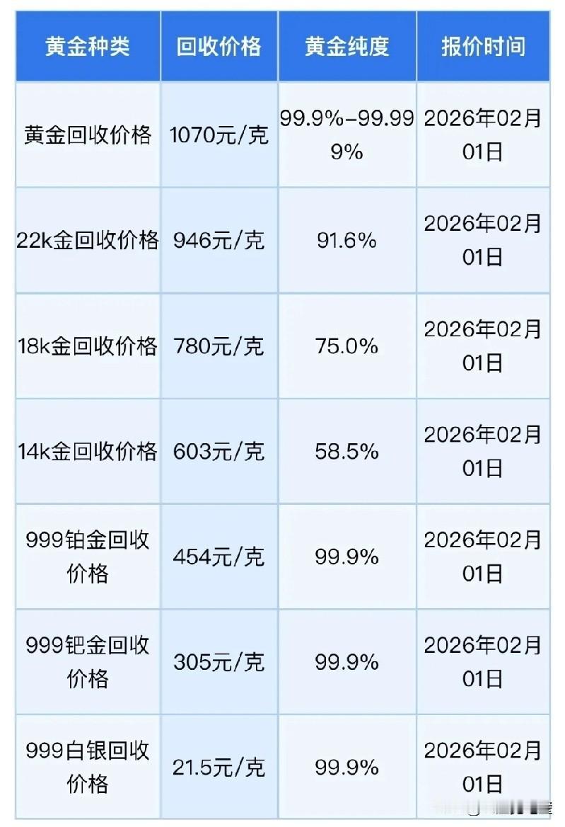 今日金价!以及今日黄金、铂金、钯金、白银回收报价与金价走势! 星期日(2月1日)黄金、铂金、钯金、白银整体回收价格又连日下跌了! 黄金1070元/克 铂金454元/克 钯金305元/克 白银21.5元/克 从价格来看,整体回收价格与1月31日相比,黄金回收价下跌40元/克,22k金下跌36元/克,18k金下跌30元/克,14k金下跌23元/克,铂金下跌23元/克,钯金下跌25元/克,白银下跌2.1元/克。 国际金价近几日走势较为惨淡,2月1日当天一度触及4686美元/盎司,创下单日最大跌幅超过12%。黄金价格分析师表示,下周金价或将继续震荡回落,4969-5000关口压制明显。 黄金回收注意事项: 1、不需折旧费,款式新旧均可。 2、先查金价,再看成色,不看品牌。 3、自己称重,公正透明。 4、黄金检测仪当场检测,不收取任何费用。 5、黄金手镯裂口免费修复。 不同纯度黄金回收价不同,谨慎投资。你说对吧?