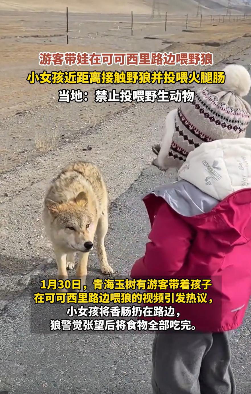 这心也是够大的!青海玉树,一女子带着6岁的女儿去可可西里,路边看到一条狼,两人非但不害怕,反而掰下一段火腿肠上前投喂,这要是不细看,还以为两人是在路边喂狗呢! 视频里,小姑娘把火腿肠丢在离狼不远的地上,那狼先是一愣,左右张望,迟疑了一会儿,才慢慢凑过去,几口就把东西吃完了 整个过程,母女俩和狼之间就隔着那么几步路,没有任何遮挡。看那样子,要不是狼保持着距离,她们可能还真想伸手去摸两下,而妈妈就站在女儿身后拍视频,这心也是够大的 好在当时那只狼的注意力全在食物上,吃完也没多停留,算是相安无事。但这场景看着实在让人捏把汗。后来玉树州林草局也知道了这事,特地提醒:当地是严格禁止投喂野生动物的。很多人可能觉得喂一下是善意,但其实对动物、对人,都可能造成麻烦 要我说,这心确实有点大了。很多人去高原、去野外,总把野生动物想得太简单,尤其是狼这类动物,看着瘦瘦的,有点像狗,就容易放松警惕。但其实它们是真正的野性生命,行为难以预测,带着孩子这样做,风险真的不小 咱们去自然里玩,欣赏就好了。远远看看,拍拍照片,别靠近,更别投食。你喂它一口吃的,可能让它觉得人类等于食物,以后见到人就凑上来,反而害了它。再说,万一它扑过来呢?野外没有防护,出事往往就是一瞬间 爱动物、爱自然,最好的方式就是尊重它们的习惯,保持距离,让它们活在自己的节奏里。这不仅是对它们负责,也是对自己、对家人负责。带着孩子出门,更得做个靠谱的榜样——有些险,真的不值得冒