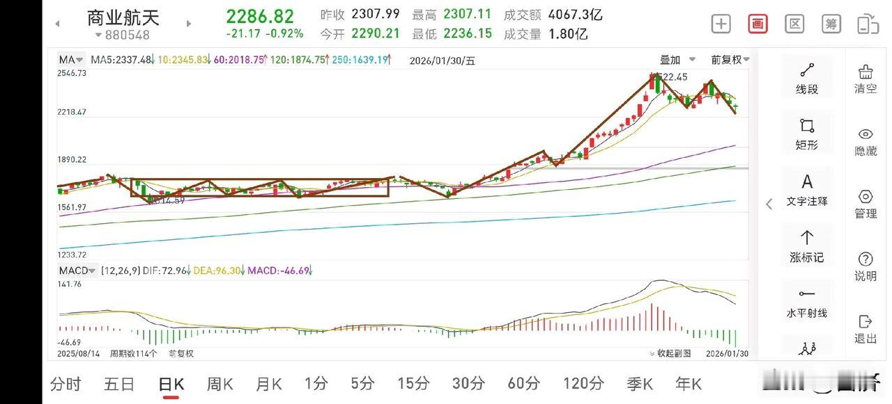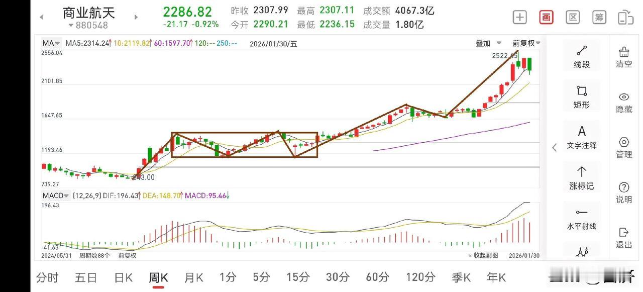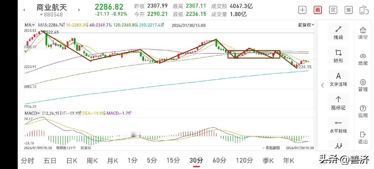 聊聊商业航天板块(2026.2.1) 商业航天板块在经过前期的一段上涨后,目前处于窄幅震荡调整过程中,待调整完成后,还将进一步向上攀升,人民日报曾发文,2026年是航天大年,所以该板块后期走势是可期的。 1.从周线图一上看,前期的上涨暂时告一段落,现在正在构建第二个周线上涨中枢,该中枢及有可能走9笔日线,目前已经完成三笔,这里的操作级别是30分钟,意思是说,如果你想在这个区间高抛低吸,可以按30分钟乃至5分钟上去找买卖点。 2.从日线图二上看,目前走了三笔日线,从前三笔完成情况来看,大致震荡区间的下沿就在周五的低点附近,也就是说,这里只有向上的震幅,向下的空间已经很窄了。 3.从30分钟图三上看,如果你想做高抛低吸,只要站上最后一个中枢上沿并回踩不破新低的时候便可进行低吸。高抛点最好选择5分钟上的卖点进行高抛,意思是说,只要5分钟走坏,就要把加的仓位退出来。总体而言,该板块无忧。 临近春节,各个板块总体都是一个区间震荡,不会出现大的行情。航空航天板块 股票复盘应该关注哪些方面