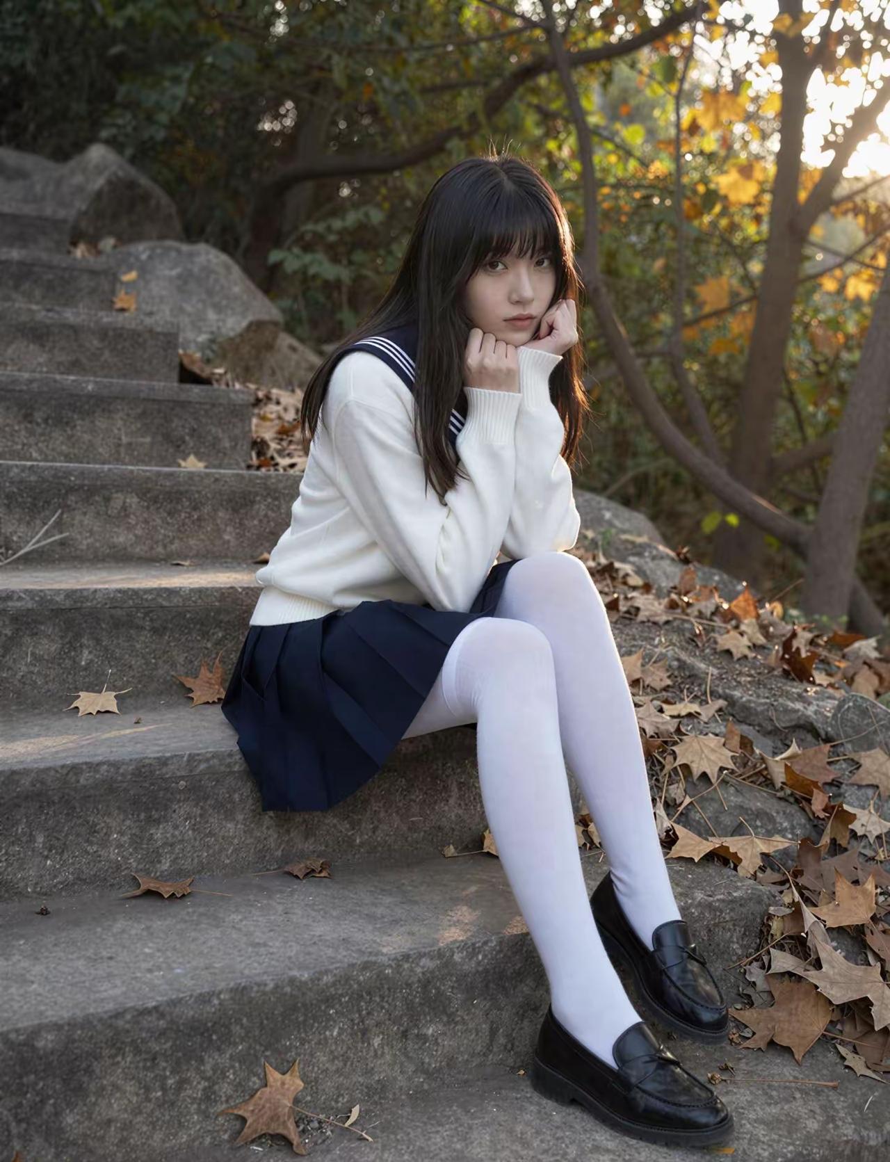 🍂 梧桐叶落在石阶上,水手领配白毛衣,把秋日的温柔穿在了身上。阳光穿过枝桠,在裙摆和袜尖落下细碎光斑,这大概就是青春里最清甜的模样。