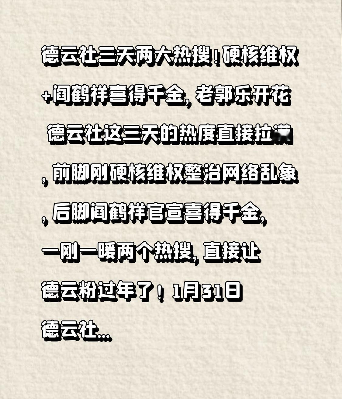 德云社三天两大热搜!硬核维权+阎鹤祥喜得千金,老郭乐开花 德云社这三天的热度直接拉满,前脚刚硬核维权整治网络乱象,后脚阎鹤祥官宣喜得千金,一刚一暖两个热搜,直接让德云粉过年了! 1月31日德云社再发维权告知函,这是开年半个月里的第二份维权声明,硬刚网络上捏造师徒反目、恶意P图丑化艺人、泄露演员行程的侵权行为,情节恶劣的已经被行政拘留。此前首份声明还被别有用心的人断章取义带节奏,德云社干脆直接划清界限:维权只针对侵权者,不牵扯任何人,互联网从非法外之地,造谣必付出代价,这波硬核操作被网友狂赞“德云社法务部支棱起来了”! 这边维权的热度还没散,阎鹤祥凌晨在粉丝群报喜的消息直接炸屏:喜得千金,六斤四两的小棉袄!谁能想到三天前还在春晚彩排现场和郭麒麟对活的壮壮,转头就荣升奶爸,听说接到产房通知时,把快板都敲成了心跳的节奏,妥妥的铁汉柔情。 更巧的是,德云社最近简直是“女儿缘”爆棚,上个月孟鹤堂刚迎来小公主,如今阎鹤祥再添闺女,后台直接组起了奶粉团购群,网友更是脑洞大开,给小宝贝排起了“筱”字辈名字,筱棉裤、筱可爱直接安排上。老郭也没闲着,微博简单一句“又添新成员”,转头就给阎鹤祥塞了厚红包,老郭家生娃送“开箱礼”的传统直接拉满仪式感。 新晋奶爸阎鹤祥更是秒变女儿奴,不仅主动申请减少演出档期,推掉了大年二十九的专场,直播里被问要不要教闺女说相声,连连摆手说“先学会叫爸爸再说”,嘴上说着狠话,手指却默默下单了带快板图案的口水巾,这反差萌直接戳中网友笑点。 一边是拿起法律武器维护艺人权益,坚守底线不手软;一边是后台添丁进口,满是烟火气的欢喜,这两天的德云社,既有直面乱象的硬气,也有家人相伴的温暖。难怪网友都说,德云社从来不止是说相声的地方,更是一个有规矩、有温度的大家庭,这波热搜,实红! 德云社维权 阎鹤祥喜得千金 德云社热搜阎鹤祥