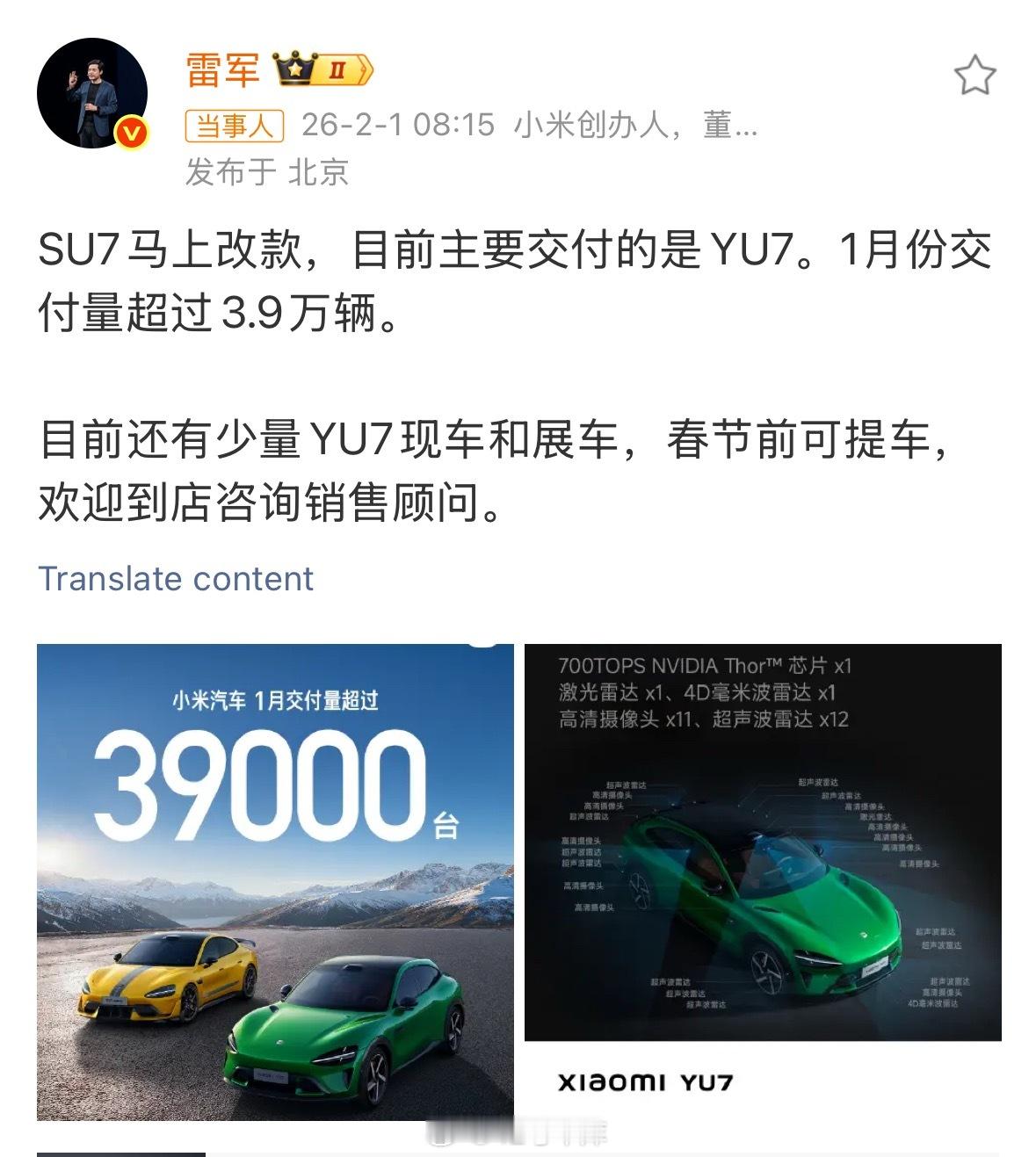 雷军回应小米汽车1月交付量小米 1 月交付量超 3.9 万辆,主要靠的是 YU7,表现非常强势。。下个月就能看到 SU7 改款的展车了?