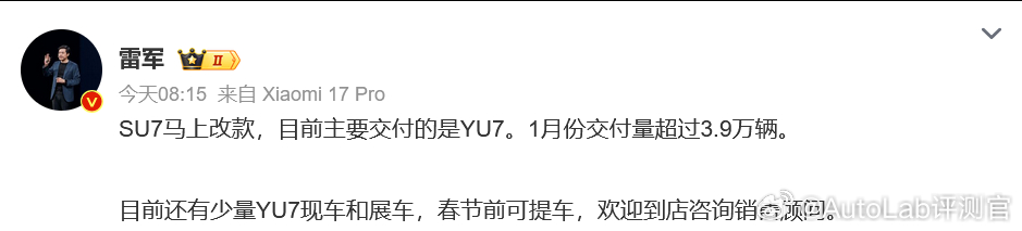 雷军表示:还有少量YU7现车和展车,春节前可提车