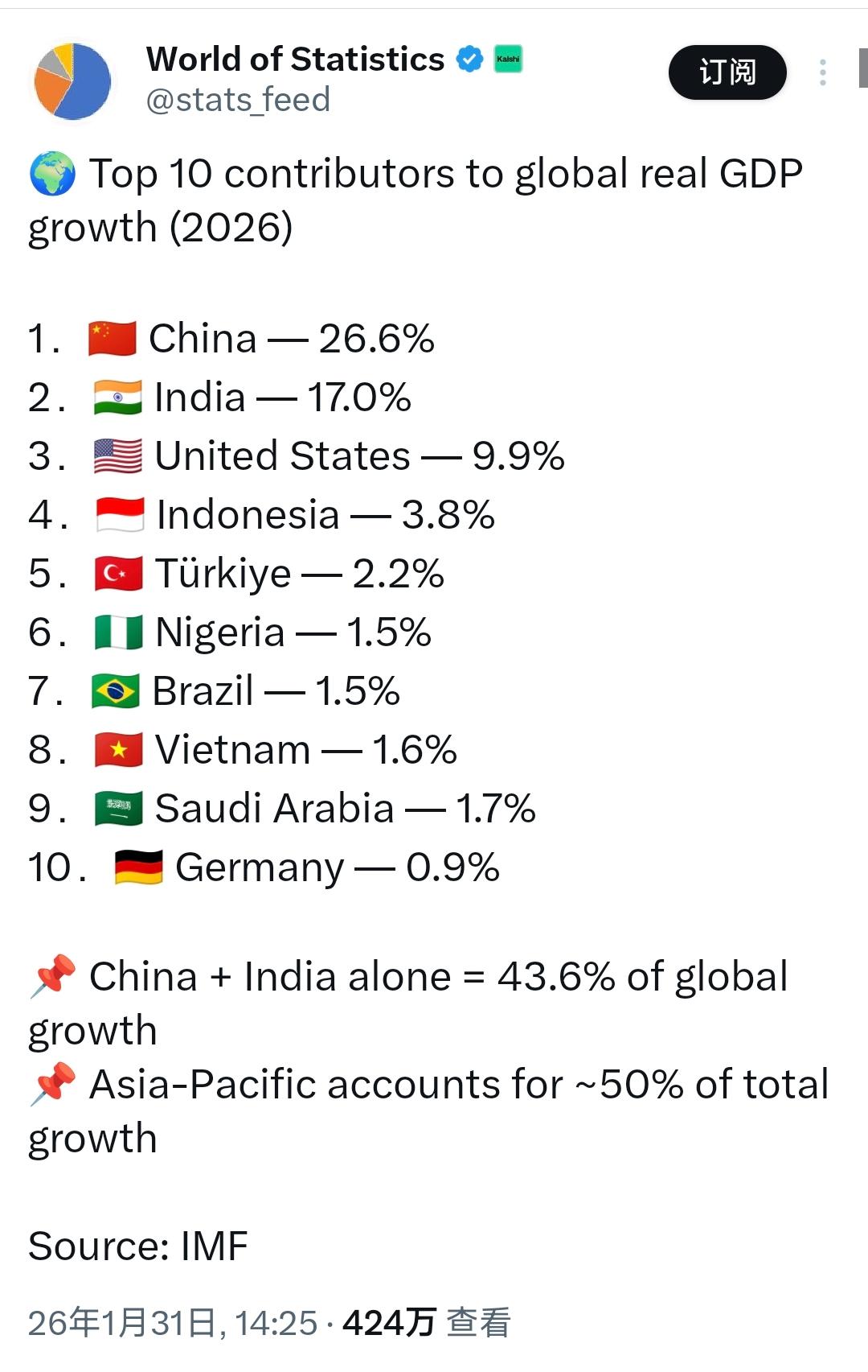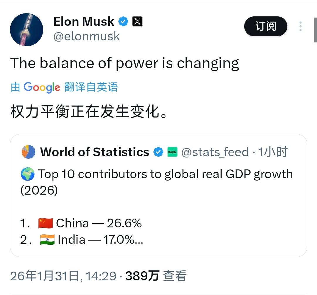 中国的实力在这一刻体现的淋漓尽致!1月31日,美国首富马斯克发文:“权力平衡正在发生变化。”并转发了“世界统计”的发文:“对全球实际GDP增长贡献最大的国家是中国!” 说白了,斯克喊出 “权力平衡正在变化”,表面看是点赞中国经济贡献,实则是戳破了 “美国独大” 的霸权幻象,更是对全球经济格局洗牌的直白确认。 要知道,他转发数据称中国是全球 GDP 增长最大贡献者,而 2025 年中国对世界经济增长贡献率确实达 30%,美国增速仅 2%,这种差距早不是秘密。这活像赛场边的裁判直言 “新领跑者已出现”,戳破了老牌冠军不愿承认的现实。 可这绝非单纯的 “富豪感慨”,而是对经济实力决定权力格局的精准判断。全球权力的核心是经济底气,中国 140 万亿元 GDP、5% 增速的体量摆在那,美国 30.6 万亿美元总量虽高但增速乏力,说白了,实力对比的天平已在倾斜。 其实,马斯克的发声,藏着商人对现实利益的精明算计。特斯拉上海工厂是其全球最大生产基地,中国新能源市场占全球半壁江山,他比谁都清楚中国经济的分量,这种表态既是事实判断,也是利益站队。 而这种 “权力转移” 不是突发的,而是长期积累的结果。中国有全球最完整工业体系,是 150 多个国家的主要贸易伙伴,“新三样” 出口年增 27.1%,这些硬实力才是增长贡献的根基。 更关键的是,美国的 “权力焦虑” 早已藏不住。搞芯片封锁、逼盟友 “脱钩”,本质是怕被中国赶超,可越打压越倒逼中国自主创新,这种 “反向助力” 让差距缩小更快。 要清楚,上世纪美国取代英国成为经济霸主时,也是靠持续的增长贡献抢占话语权,如今中国重走这条 “实力登顶” 路,历史规律从未失效。 而未来,若中国保持 5% 左右增速,2035 年前后名义 GDP 有望超越美国,全球产业链、货币体系都会随权力平衡调整;若美国继续搞 “脱钩断链”,只会加速自身份额流失,被盟友抛弃。但无论哪种,中国作为增长引擎的地位不会变,马斯克点破的 “权力变化” 也会持续深化,这是实力决定的,不是谁能阻止的。 说到底,马斯克的发文核心是承认 “经济实力决定权力格局” 的铁律。中国对全球增长的贡献,本质是自身发展的必然结果,更是多极化时代的鲜明注脚。霸权终将让位于实力,这才是最真实的世界大势。 以上是小编个人看法,如果您也认同,麻烦点赞支持!有更好的见解也欢迎在评论区留言,方便大家一同探讨。