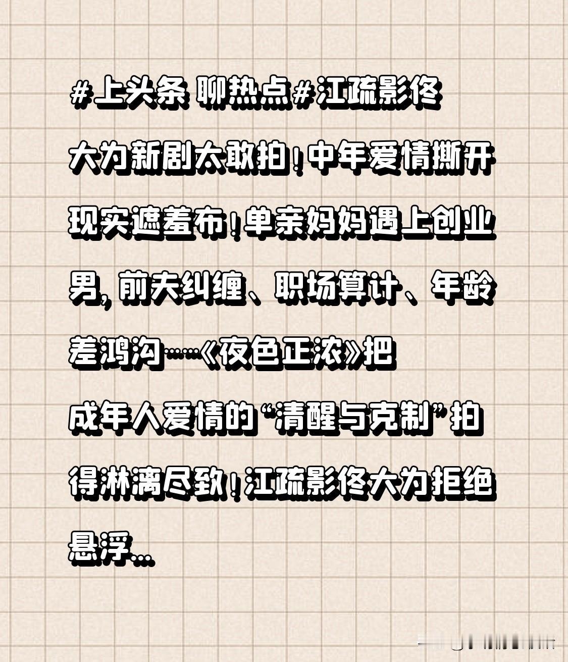 江疏影佟大为新剧太敢拍!中年爱情撕开现实遮羞布! 单亲妈妈遇上创业男,前夫纠缠、职场算计、年龄差鸿沟……《夜色正浓》把成年人爱情的“清醒与克制”拍得淋漓尽致!江疏影佟大为拒绝悬浮,用细腻演技诠释中年人的拉扯与成长,开播即霸屏热搜,网友直呼“这才是真实爱情的样子”! 中年爱情也能甜而不腻、虐而不狗血!你觉得剧中哪对CP最好嗑?评论区聊聊,点赞收藏,一起追剧!