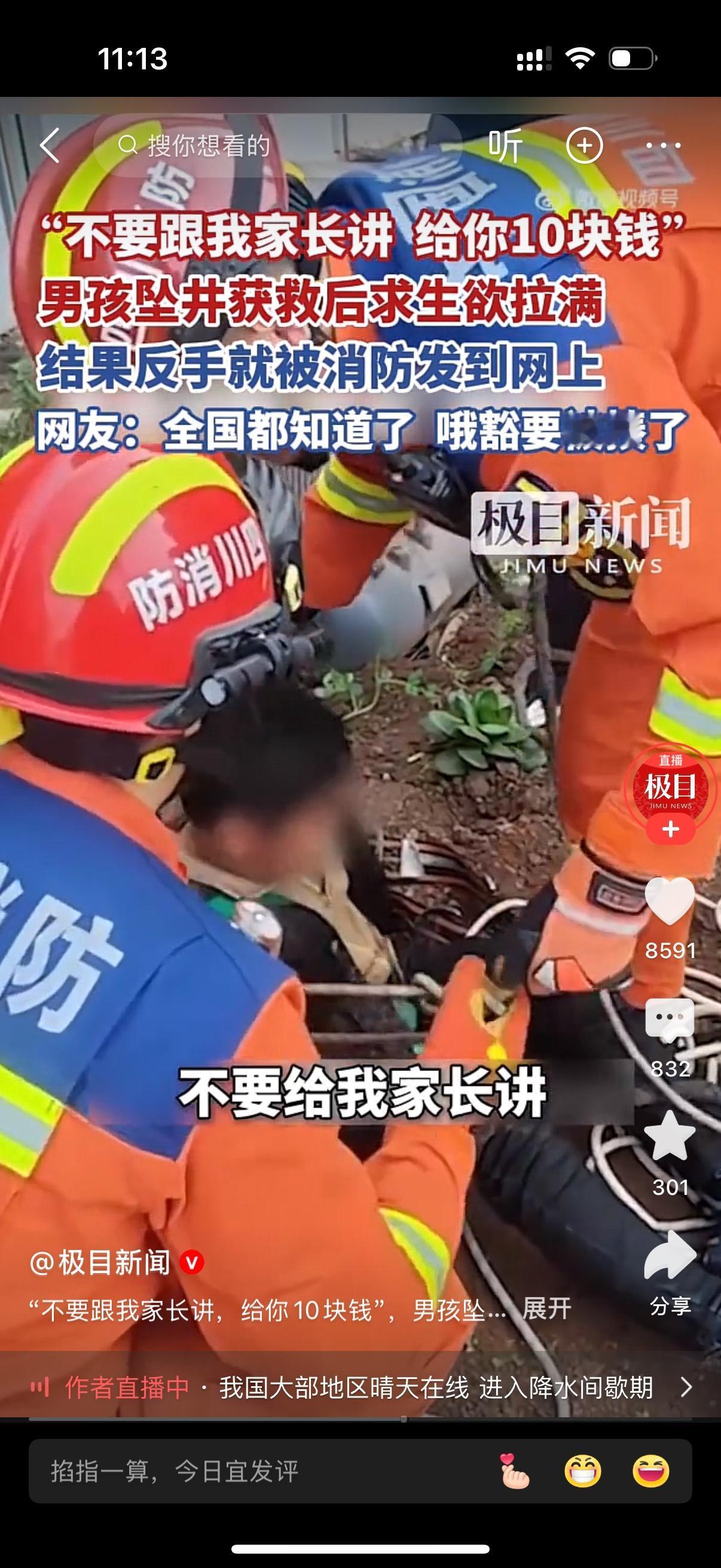 四川一男孩在外玩耍时不小心掉到枯井里。消防员把他安全救出。男孩获救后求生欲满满,他跟消防员说,不要跟我家长讲。男孩还试图“收买”消防员,我给你10块钱,不要跟我家长讲。结果这一切反手就被消防发到网上,全国都知道了,哦豁要被揍了。