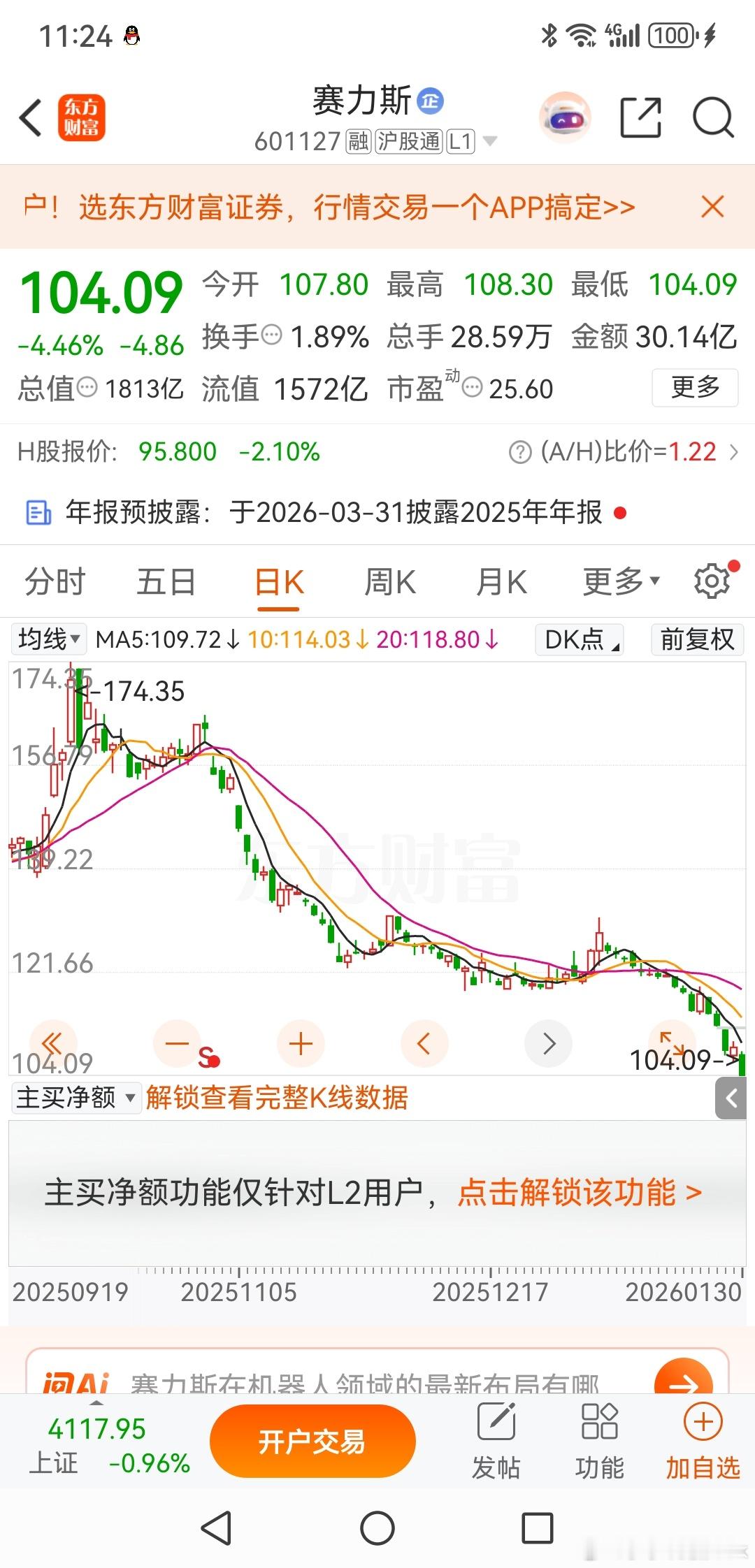 赛力斯,没想到跌的这么惨赛力斯,今天有位群友问深套怎么办?这个群友,在11月份的时候咨询过一次,当时我给出的意见是反弹减仓,但千万不能补仓摊低成本,因为一旦节奏错了,会重仓套死。赛力斯,从174跌倒104,不可谓不惨,但你去看看他的同行比亚迪、小米,可能也能够感觉到什么?赛力斯的这个走势,除了华为光环的消失,整个市场环境也是很重要的原因。赛力斯,这一波下来,几乎是不带反弹的,目前正处于一个c浪杀跌的过程中。这个c浪杀跌,到底什么时候能结束,现在没有办法给出答案,我只能说现在是个割下去了。我客观的讲,但目前为止,依然没有看到大规律止损盘出来的迹象。我只能说,一个浓眉大眼的家伙,跌成这样实在太惨了。想割肉的割不下去,想补仓的还没到时候,左右为难。欢迎加入我们的免费交流群财经股票