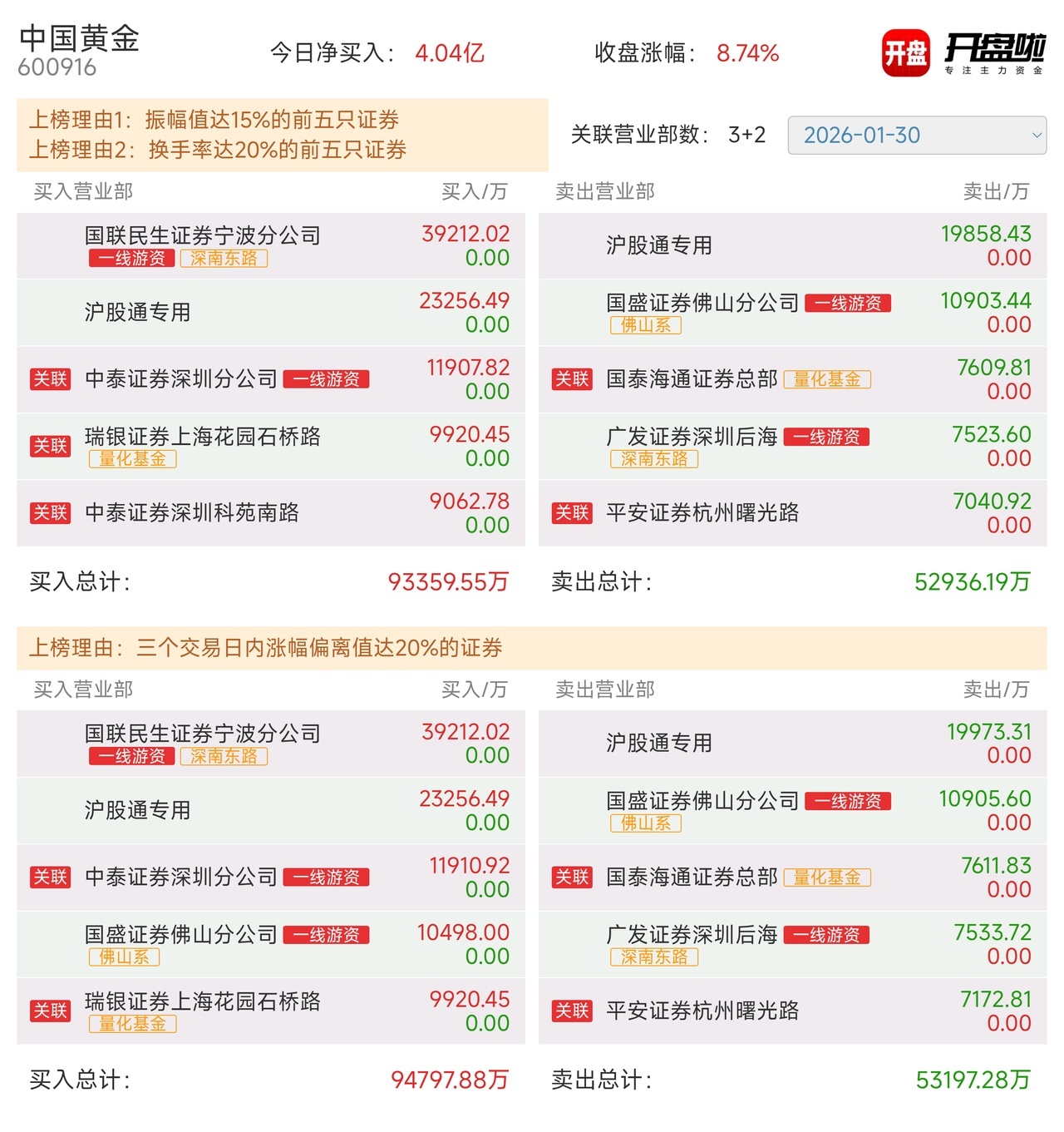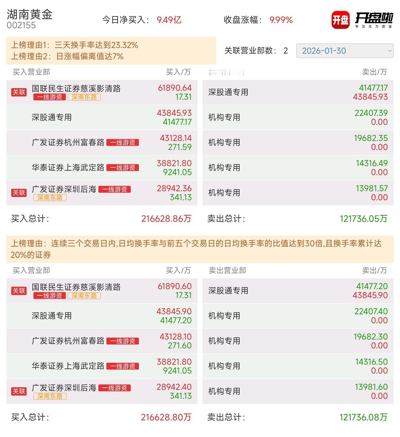 不要迷信龙虎榜大佬,湖南黄金、中国黄金,周五的龙虎榜显示:多个一线游资大佬疯狂买入,其中湖南黄金净买入9.5亿,湖南黄金净买入4亿。