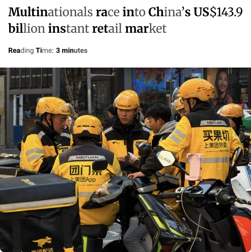外媒:越来越多的跨国公司开始在中国推出专属的即时配送服务,或在现有服务基础上进行升级,以抢占这个价值达1439亿美元的即时零售市场。这些公司争相在高度数字化的市场中脱颖而出,满足消费者对即时服务的强烈需求。