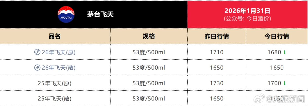#茅台经销商说一天调价四五次#【#茅台批价持续上涨经销商发声#:一天调价四五次】节前茅台价格的上趋势出现轻微回调。1月31日,“今日酒价”披露的批发参考价显示,26年飞天茅台散瓶价格报1650元/瓶,26年原箱价格由前一日回落至1680元/瓶。此前飞天茅台批发价单日涨幅超过百元。记者了解到,近日武汉地区飞天茅台的线下成交价出现大幅波动,”一天五个价“,普遍高出上述参考批价近百元。一位酒商告诉记者,今日散瓶飞天对外售1760元/瓶,一次拿三件以上每瓶才可到1750元,昨天单瓶价格一度涨至1800-1820元,是近三个月来的最高。“虽说越临近春节就波动越大,但昨天一天之内就调整了四五次之多,上午向客户报的价,中午就不行,中午刚报完价,下午又变了,最后只能对外讲以实时报价为准,我做了这么久多年酒也是第一次见。”该酒商表示。一位茅台体验馆人士告诉记者,普茅年底需求量大,连日来一直在涨,目前的价格是每瓶1800元,若要以1499元的价格拿,则需整箱购买并接受搭售其他系列酒产品。例如,买一件(6瓶)1499元的飞天,需配6瓶单价1050元的大运河1935,或配同样数量的汉酱茅(795元/瓶)。#茅台#