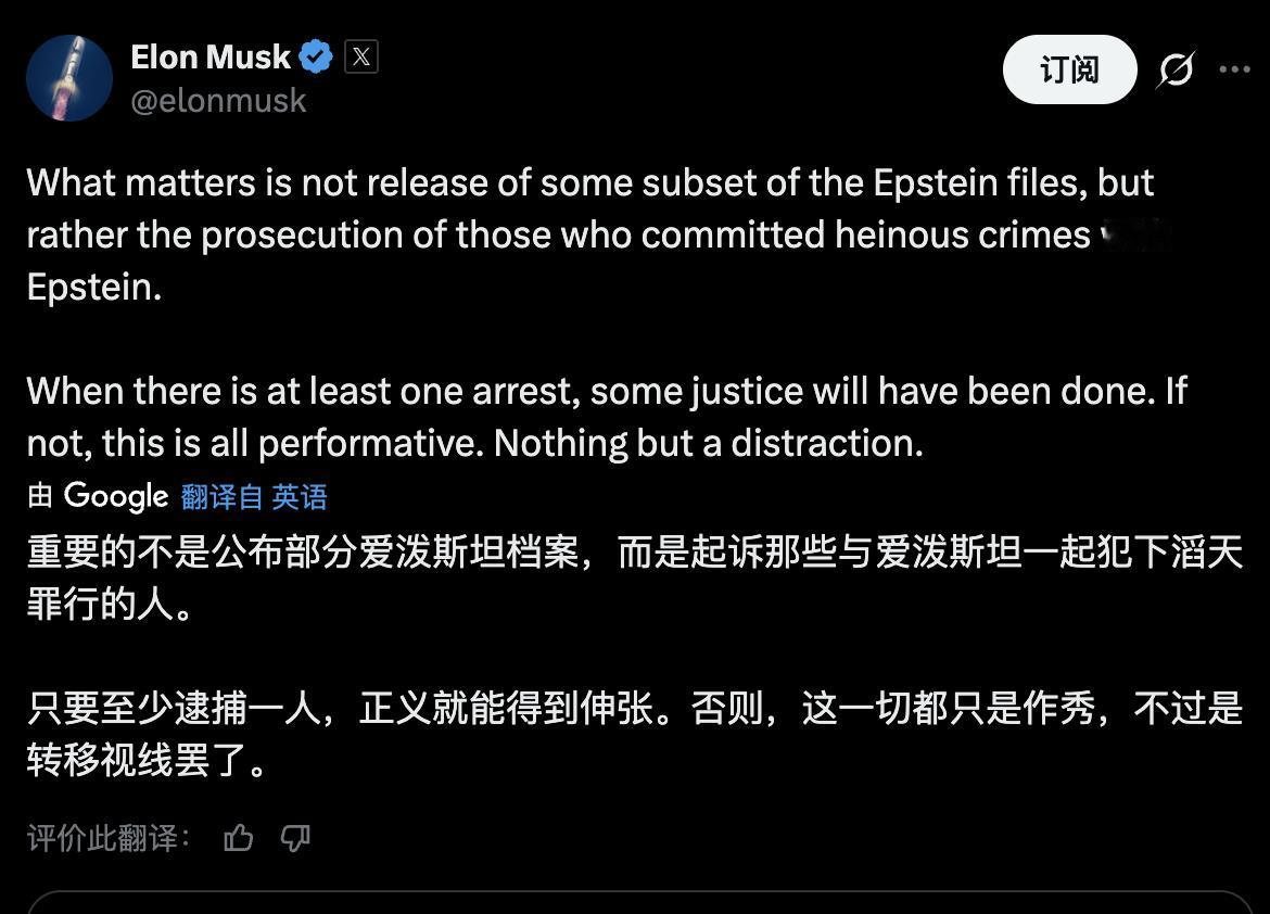 马斯克出现在爱泼斯坦文件上:现在他又说名单已经不重要!近日公布的爱泼斯坦档案中曝光了马斯克计划前往爱泼斯坦岛参加“最疯狂派对”的电子邮件。曝光的文件包含了马斯克和爱泼斯坦在 2012 年 11 月的电子邮件往来,其中爱泼斯坦问马斯克:“你打算派多少人乘直升机去岛上?”马斯克回应道:“可能只有我和塔露拉。我们岛上哪天/哪晚会举办最疯狂的派对呢?”马斯克指的是他当时的伴侣塔露拉·莱利,他在2010年代与她结过两次婚,也离过两次婚。一个月后,圣诞节早上,马斯克再次给爱泼斯坦发了一封电子邮件,询问爱泼斯坦是否能帮助他在“派对场合”“放松一下”。这段信息戳穿了马斯克此前否认与爱泼斯坦有友谊的说法。然而在这段文件曝光后,马斯克立刻表示:“重要的不是公布爱泼斯坦档案的某些部分,而是起诉那些与爱泼斯坦一起犯下滔天罪行的人。只要至少逮捕一人,正义就能得到伸张。否则,这一切都只是作秀,不过是转移视线罢了。”