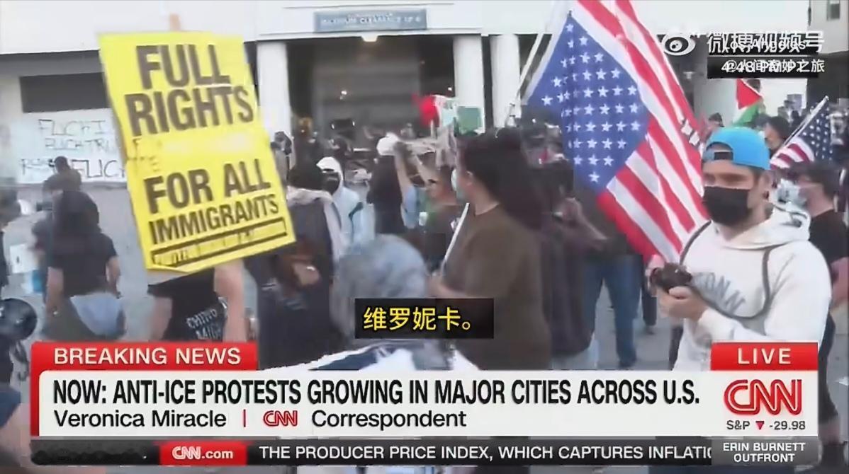 洛杉矶警方发射低致命性弹药驱散市中心反ICE抗议者。有CNN女记者被击中,一名被击中的男子展示了自己被击中部位。还有15岁男孩也被击中,另有许多人被捕。 这名CNN女记者叫做维罗妮卡,当时正在与总部主播连线。她讲道:“当地时间下午1点,市政厅开始了一场抗议活动。”突然表示腿部中弹,咳嗽不止。她本人表示抱歉,有点喘不上来气,随后直播中断。 结合之前被ICE与边境巡逻队击毙的蕾尼、普雷蒂来看,在美国抗议有风险,加入需谨慎。