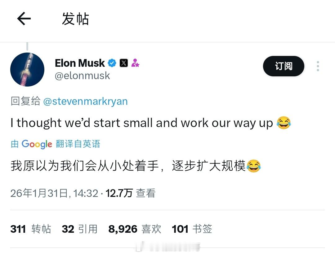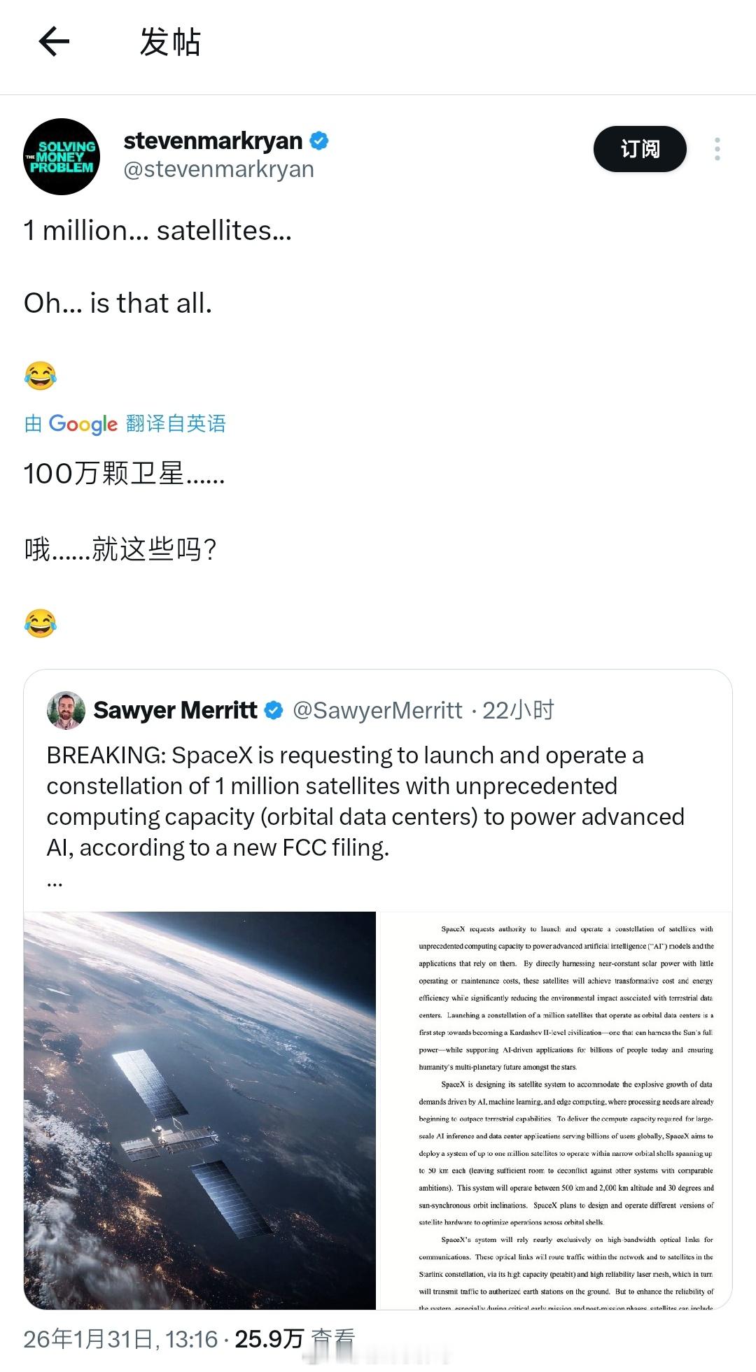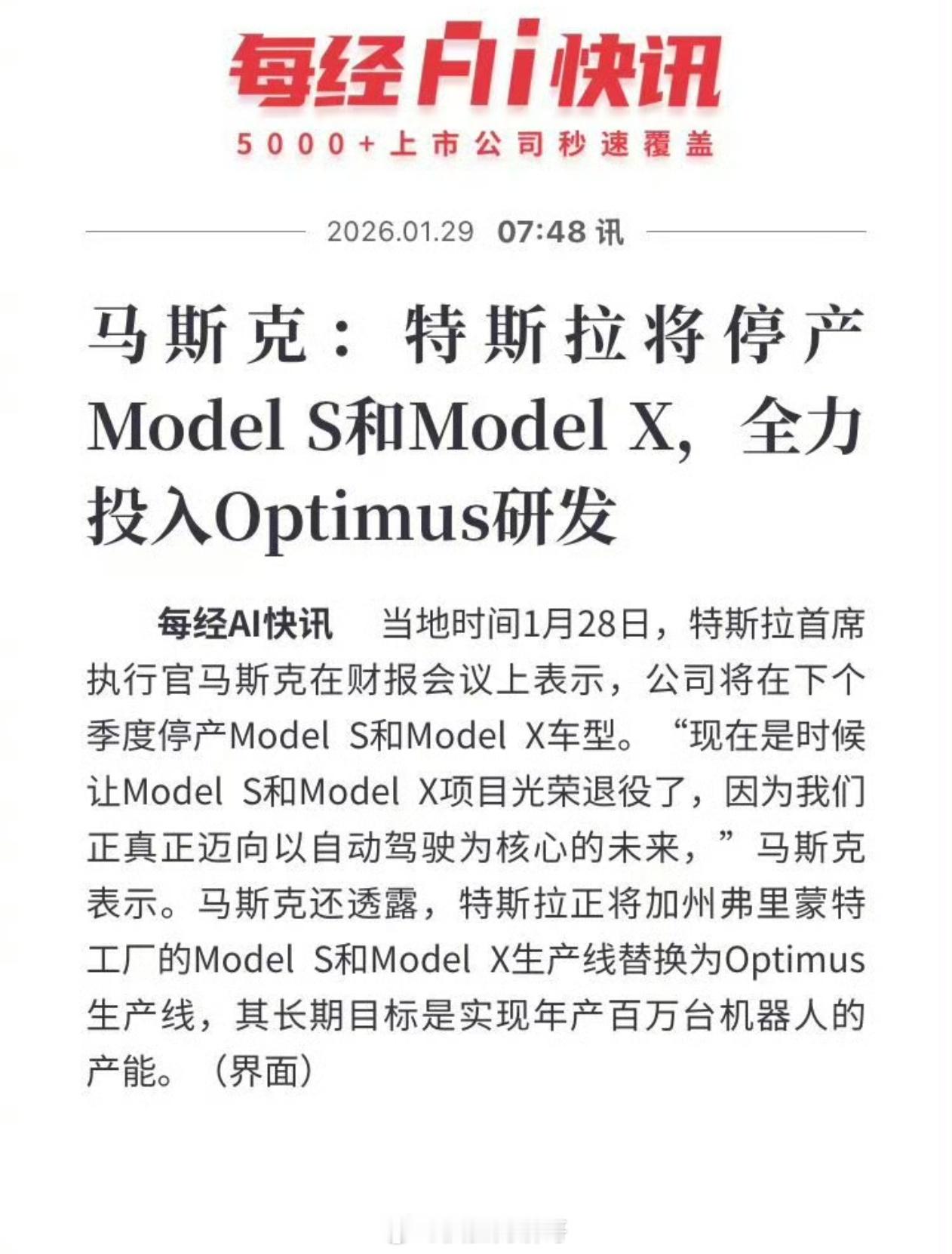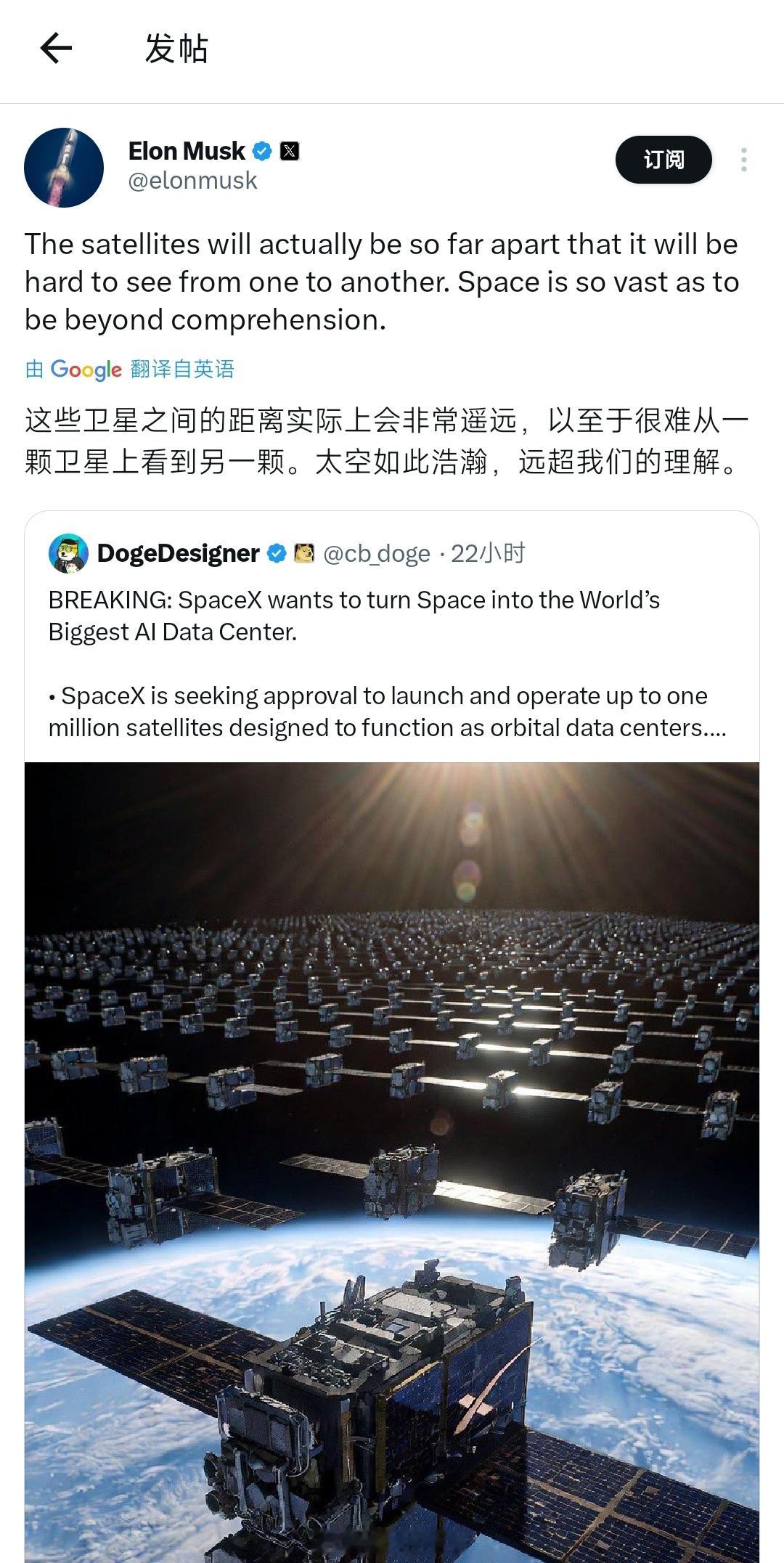 马斯克回应SpaceX申发百万颗卫星 这么说目前的现状,很多车企还在命出新车、卷下一台车,特斯拉已经在卷下一个物种了,准备停产Model X和Model S造人型机器人和申请部署100万颗卫星。