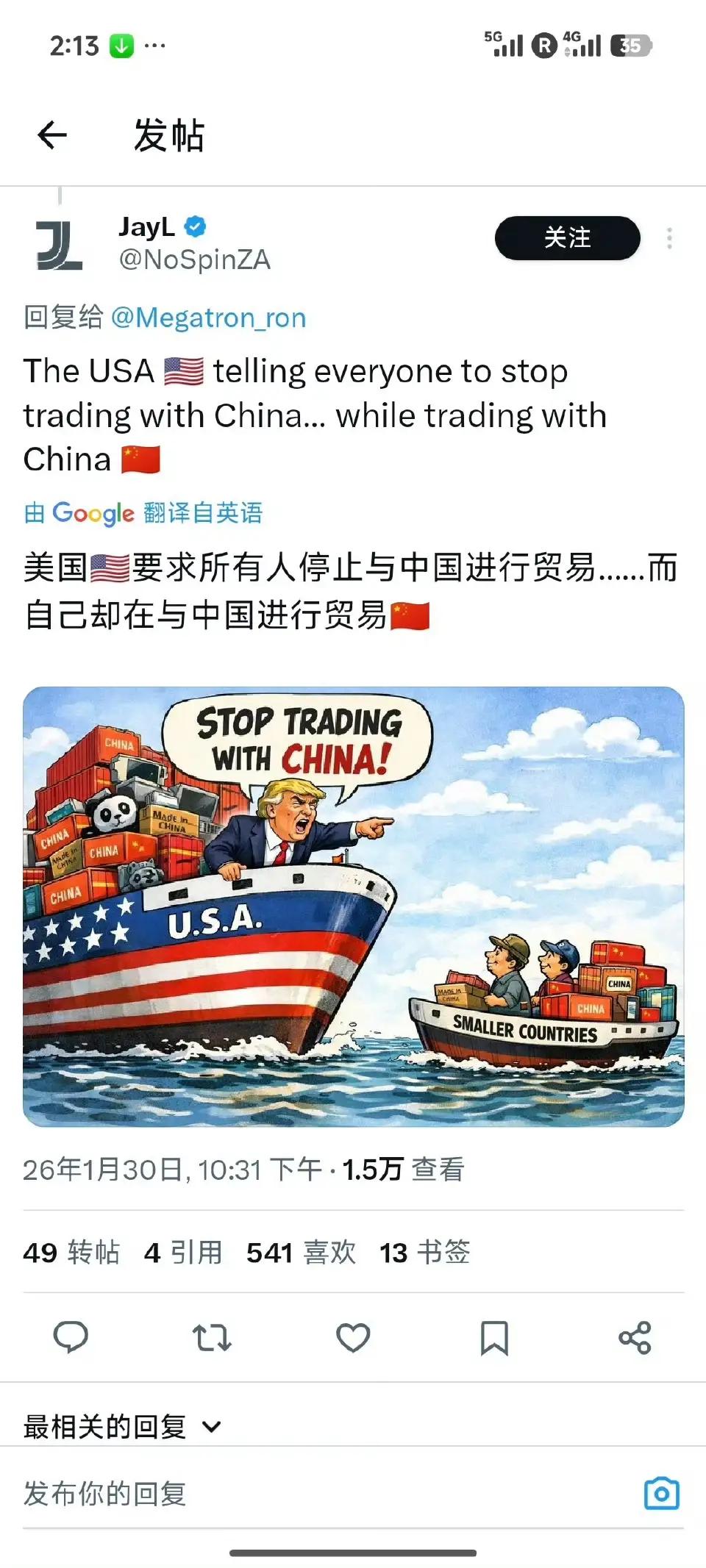 美国要求所有人停止与中国进行贸易……而自己却在与中国进行贸易。是典型的“只许州官放火,不许百姓点灯”。