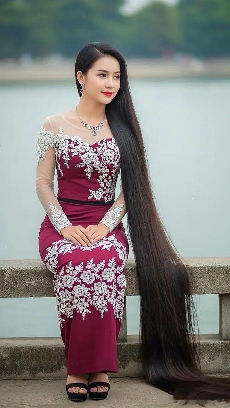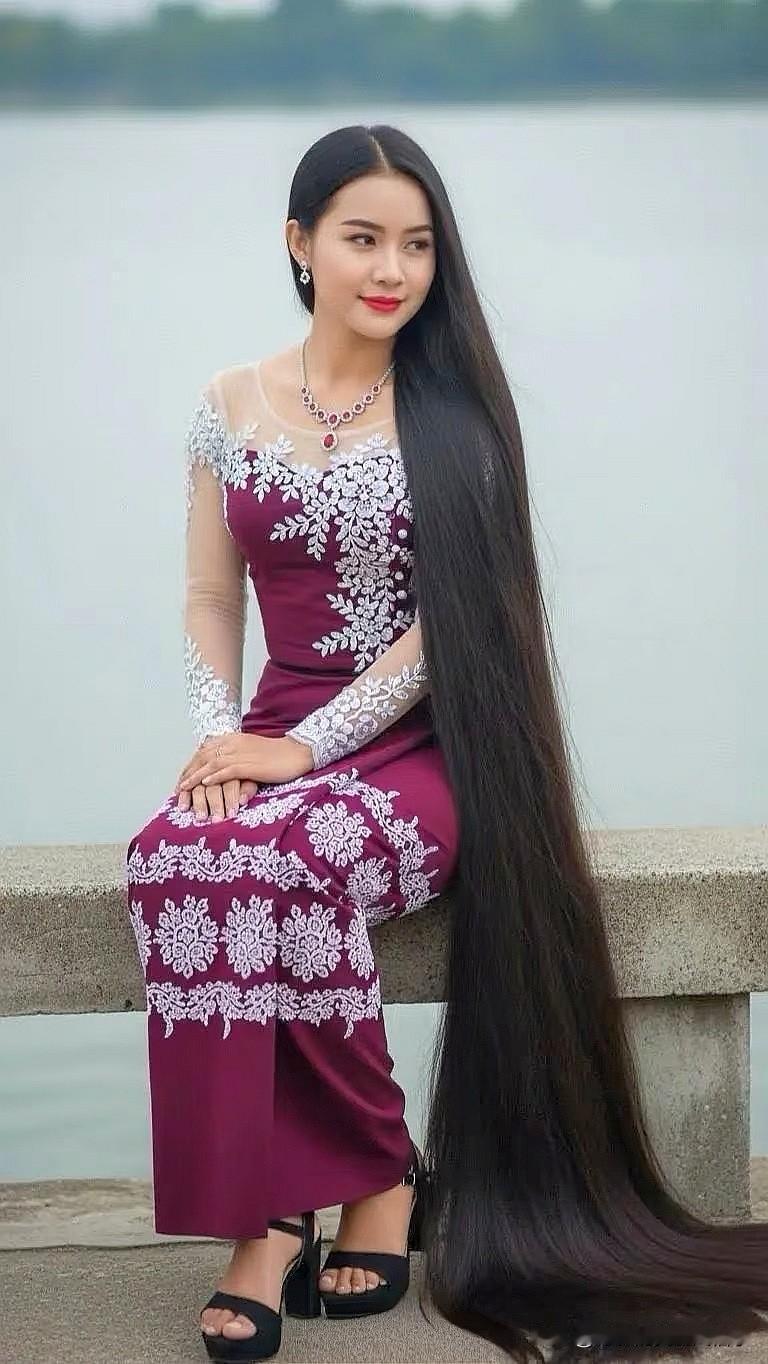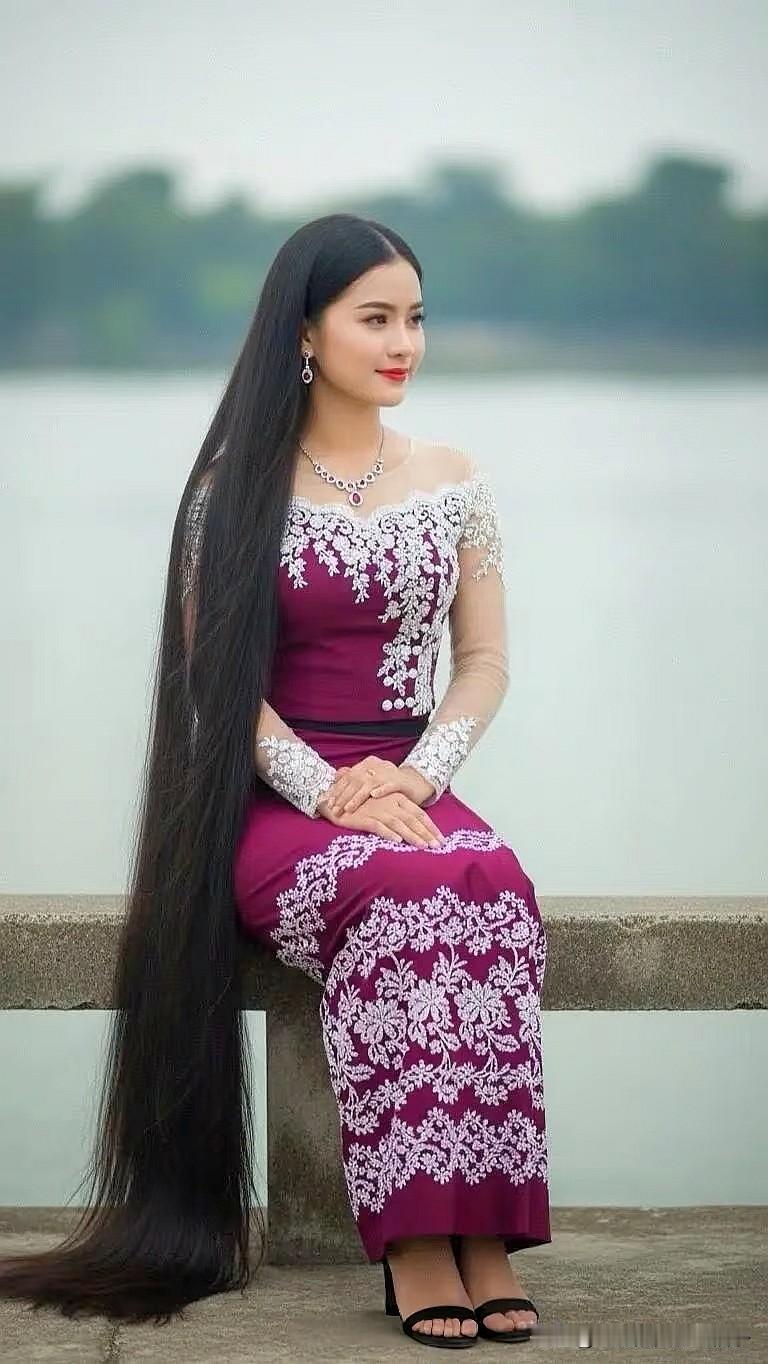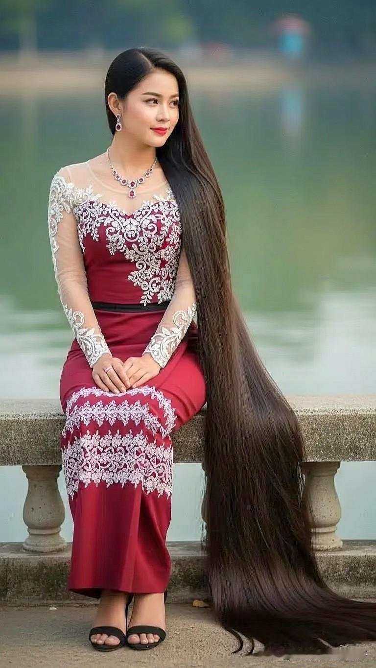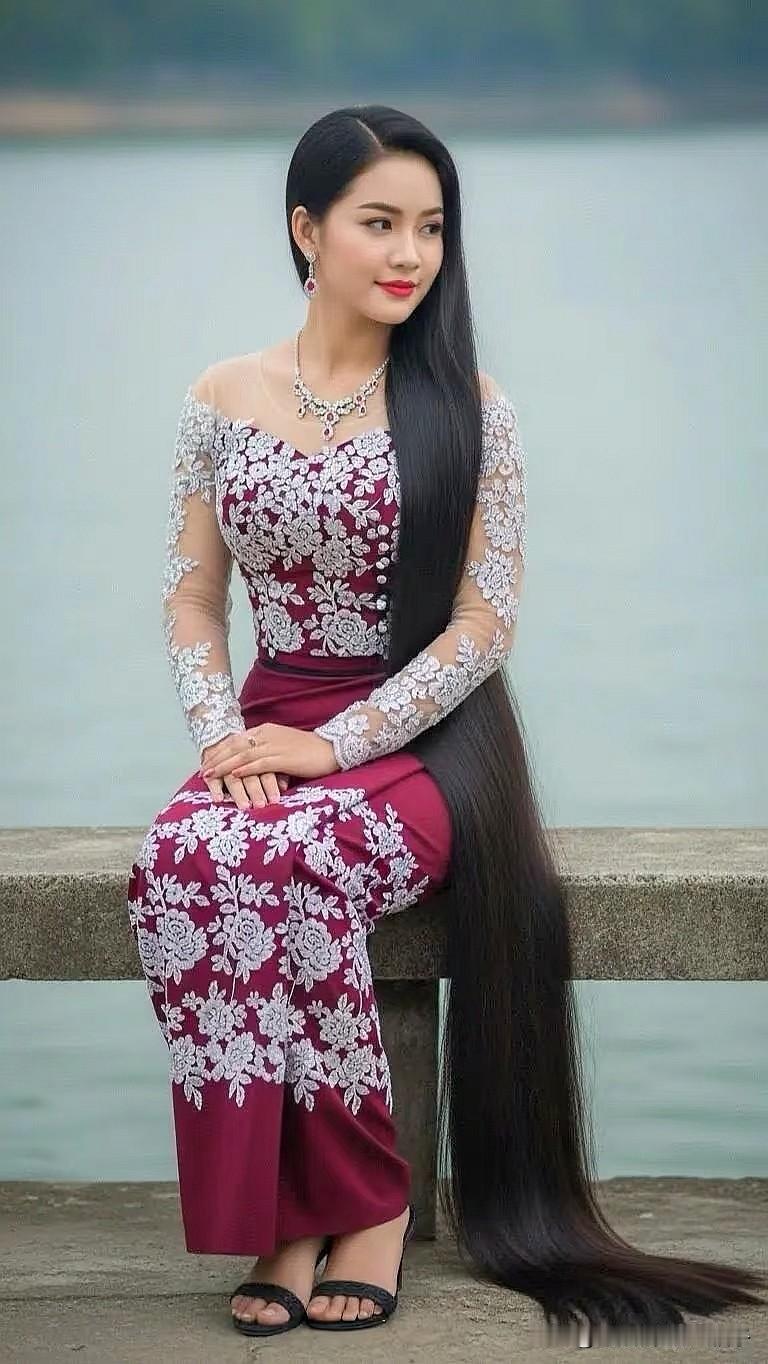 惊艳的东方美人,长发飘飘,身着华美的传统服饰,坐在湖边,宛如仙子下凡。