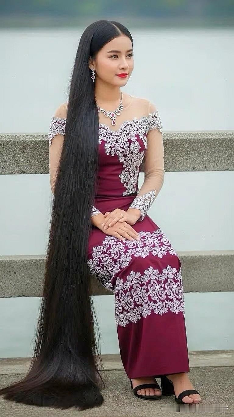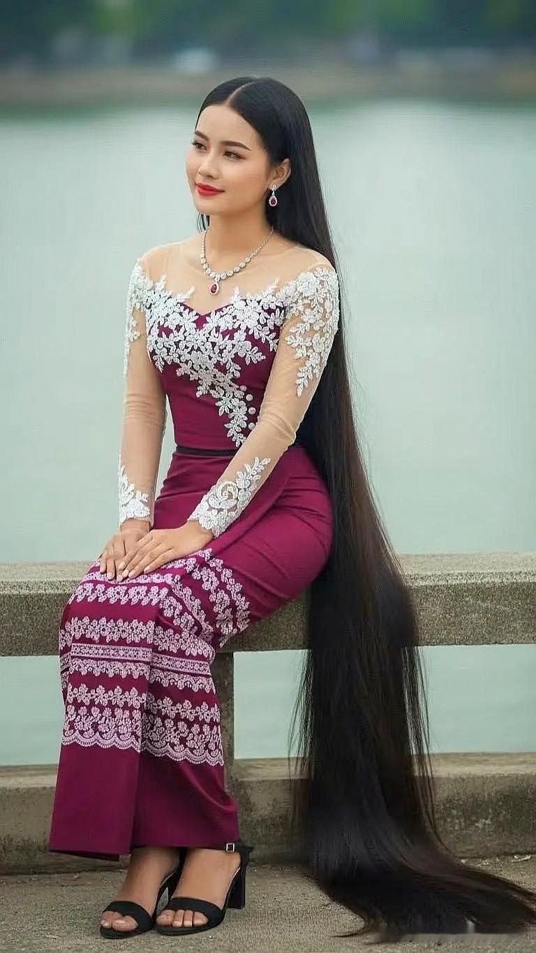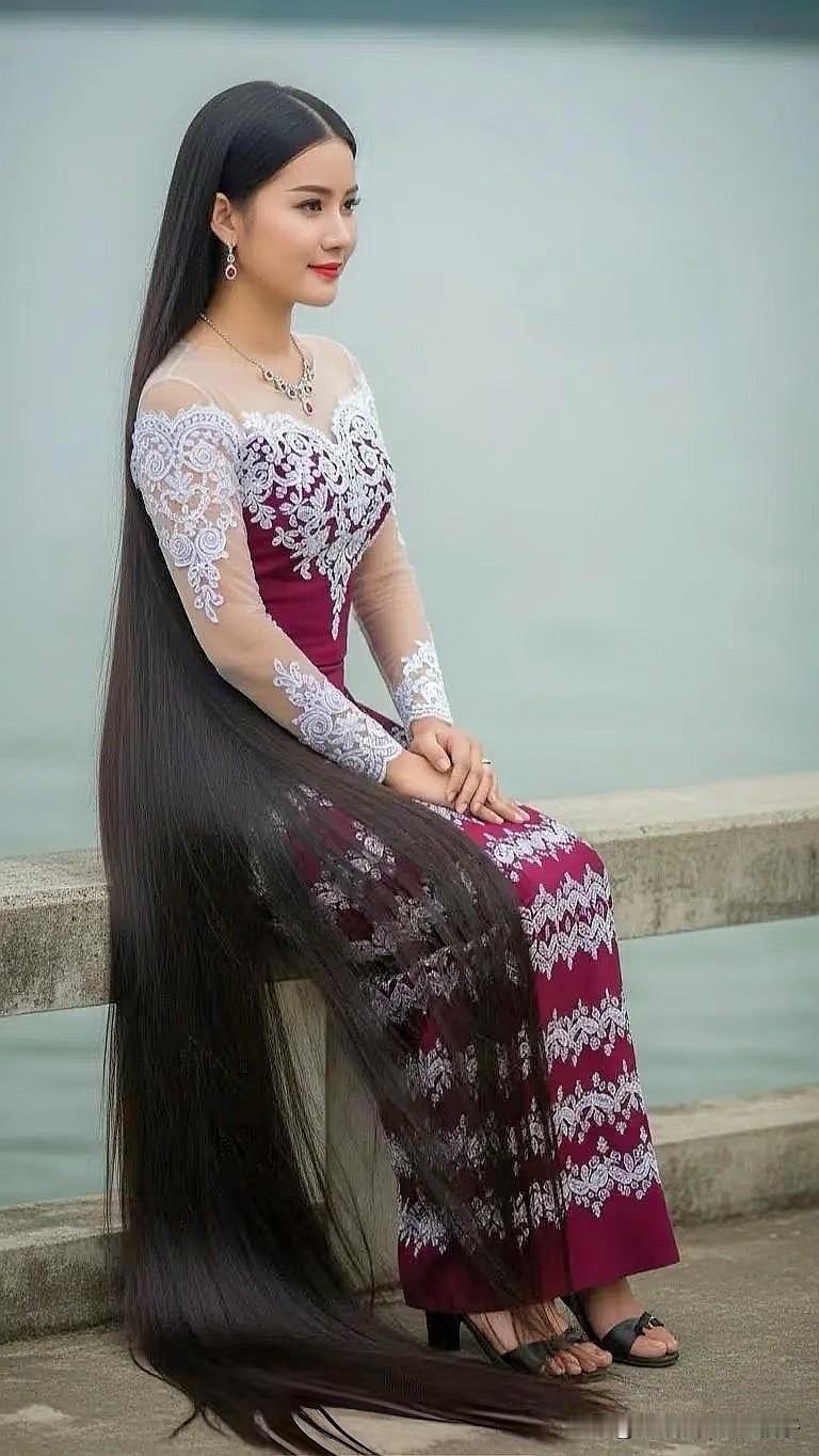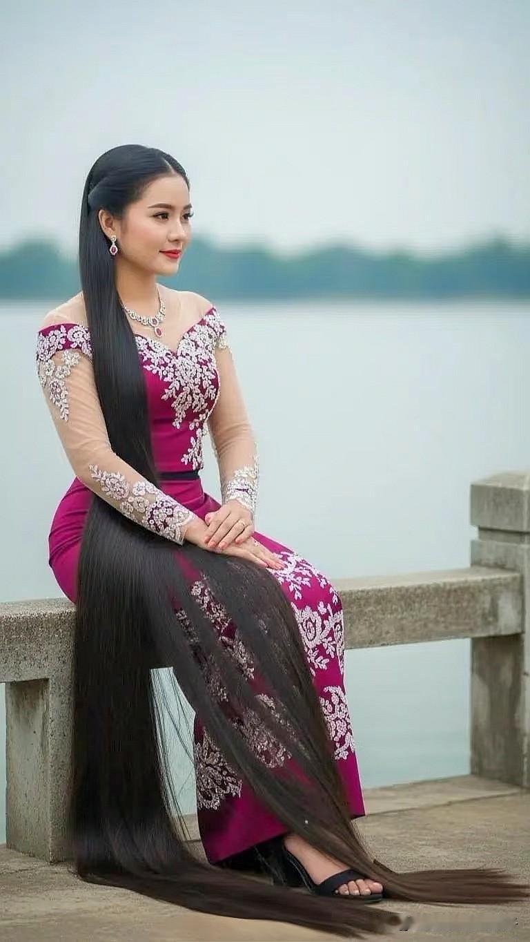 惊艳的东方美人,长发飘飘,身着华美的传统服饰,坐在湖边,宛如仙子下凡。