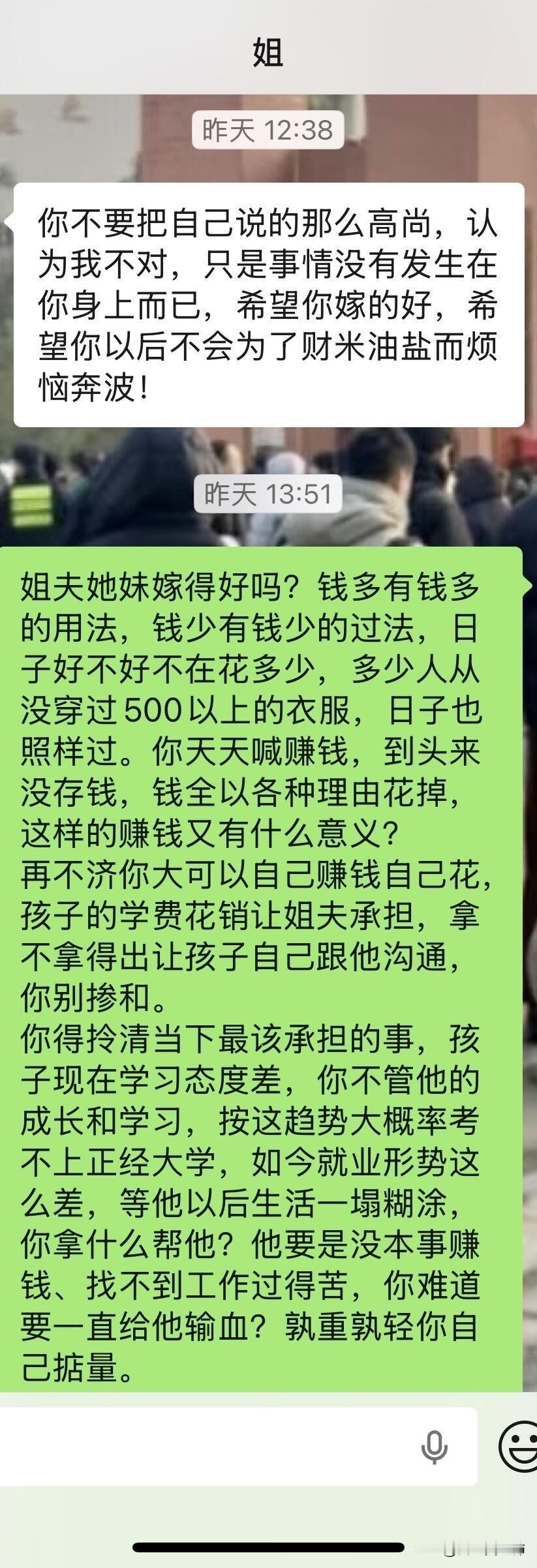 被亲姐单删了! 事情的起因是这个寒假,他想把我外甥送到我这边来,让我教他做作业,但是呢,因为去年暑假他就送了过来这边,起初我还是特别高兴的,但是孩子的学习态度特别差,真的是那种叫他写一个字等于逼他吃刀的那种,好多次都是我从早上就开始叫他写作业,他不肯写,然后我就陪着他抓着他到沙发上面坐着不准他动,他硬是跟我犟了几个小时犟到了晚上他才肯写几版作业,孩子还不长记性循环往复 所以那个时间搞得我也非常的痛苦,精神崩溃。而且他在这里好吃好喝好玩的伺候着,他回去了,一家人连个电话都没有感觉我的这些痛苦这些精力都不被看见,所以这个寒假他在想送过来,我怎么样我也不想接了,她也不顾我的拒绝我的感受,硬是要把我外甥推给我,我说除非你一起过来你孩子肯学我才能教,她也不愿意,那我就有点着急了,我说你不要把你的责任转嫁到我的身上,我说你自己当初要生怎么就不管,然后他就微信给我发了第一句话,最后聊着聊着直接破防了,最后直接把我删掉了,怎么说呢,这次他把我删掉,我反倒是松了一口气,他一直把我当工具人使用从来不顾我的意愿,从来都是直接指挥我要去帮她做什么 完全不顾我有没有时间 包括上一次我大外甥骑车摔了一跤,把嘴巴都摔破了,他跟我说我大外甥最近心情有点不好,让我过来守着他 我是真的一瞬间不知道怎么回答,这么大个人让我来守着?我还能守他一辈子吗? 以前她在我心里面的地位其实是高于我妈妈的存在。我一直很感恩他,很多事情我能做的,我一直都用心的帮她去做,我也希望他好,但是现在他做的很多事情都非常的伤人,其实一直在消磨我对她的感情